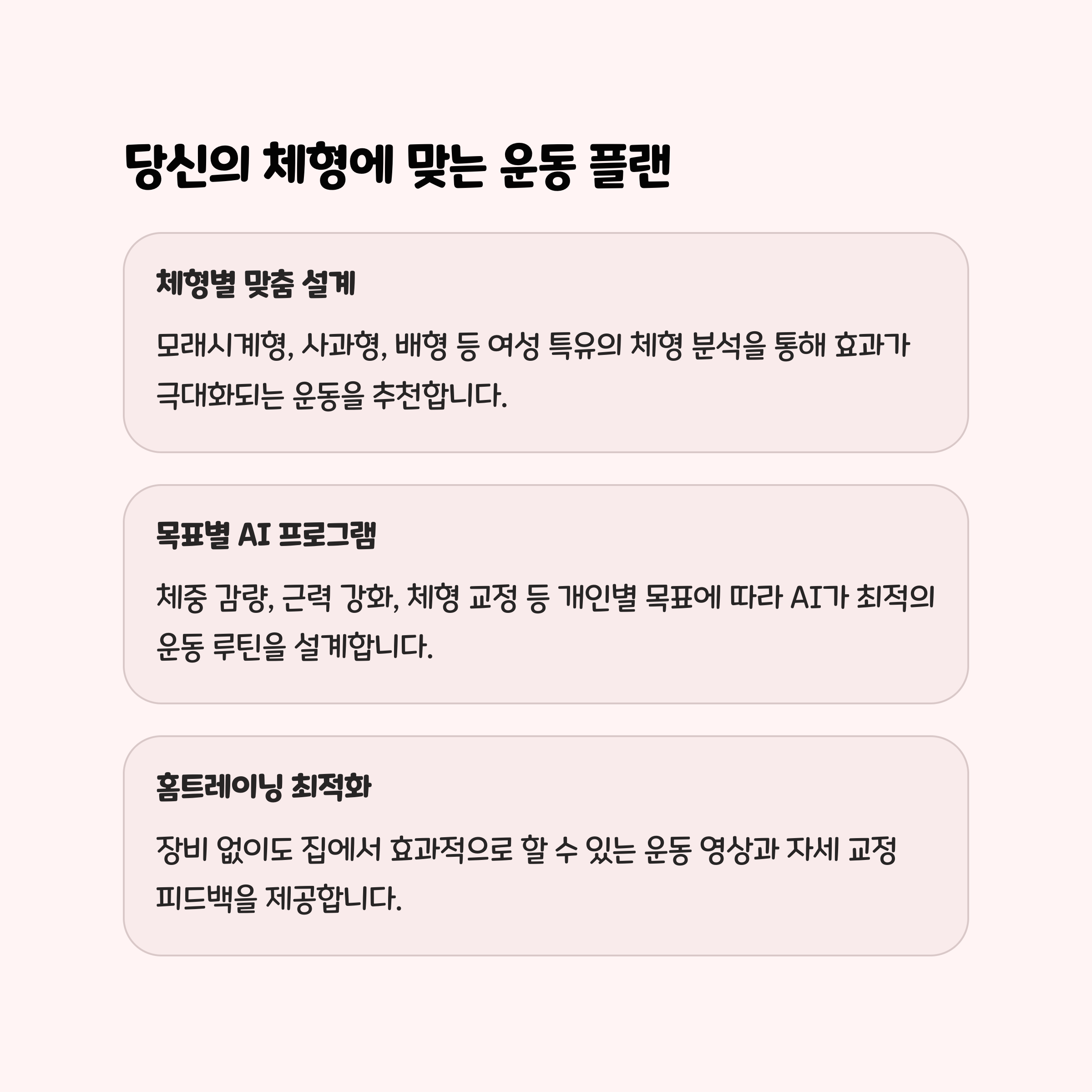 바쁜 일상 속에서도 집에서 간편하게 운동할 수 있도록, 2~7분 내외의 짧은 운동 루틴과 부위별 맞춤 운동을 제공합니다. 복부, 허벅지, 팔뚝 등 여성들이 신경 쓰는 부위별 선택이 가능해 효율적입니다.