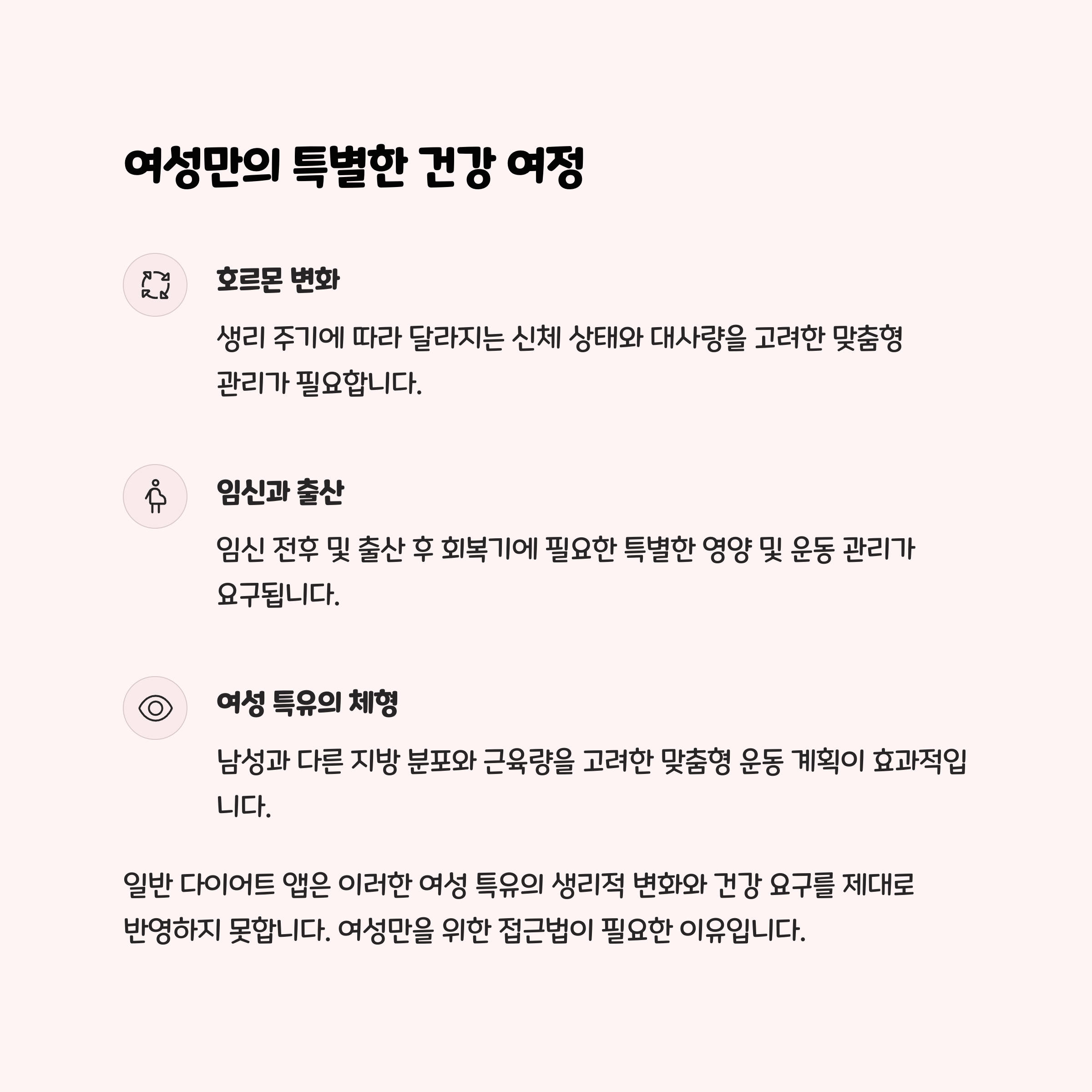 여성 전용 앱은 생리 주기, 체형, 임신·출산 등 여성만의 신체적 특성을 반영해 맞춤형 운동, 식단, 건강관리 기능을 제공합니다. 일반 앱보다 여성의 라이프사이클에 최적화되어 있어 더 세심한 관리와 동기부여가 가능합니다.