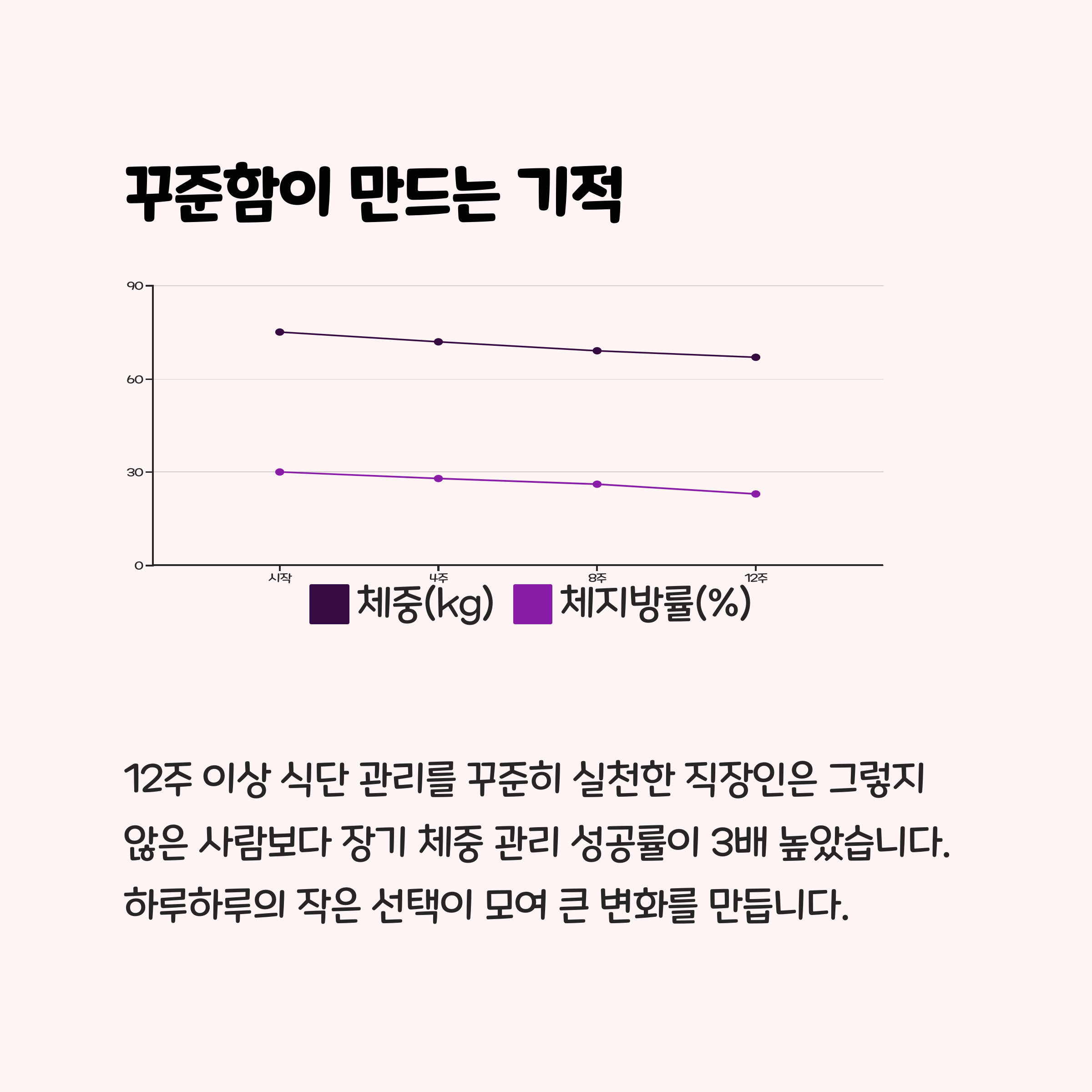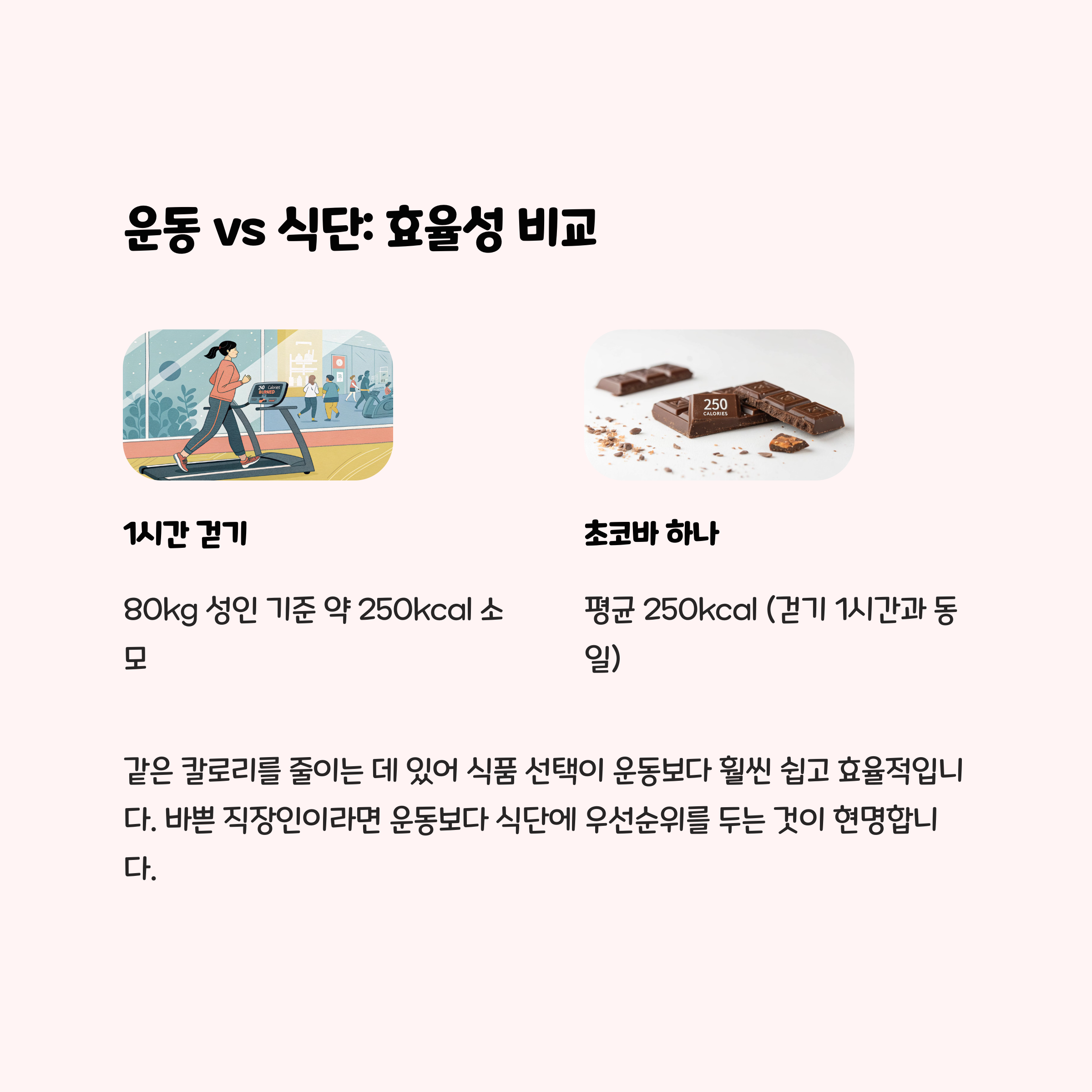- 운동은 시간과 체력이 필요하지만, 식단 조절은 간식 줄이기, 음료를 물로 바꾸기 등 작은 습관 변화만으로도 실천할 수 있습니다.