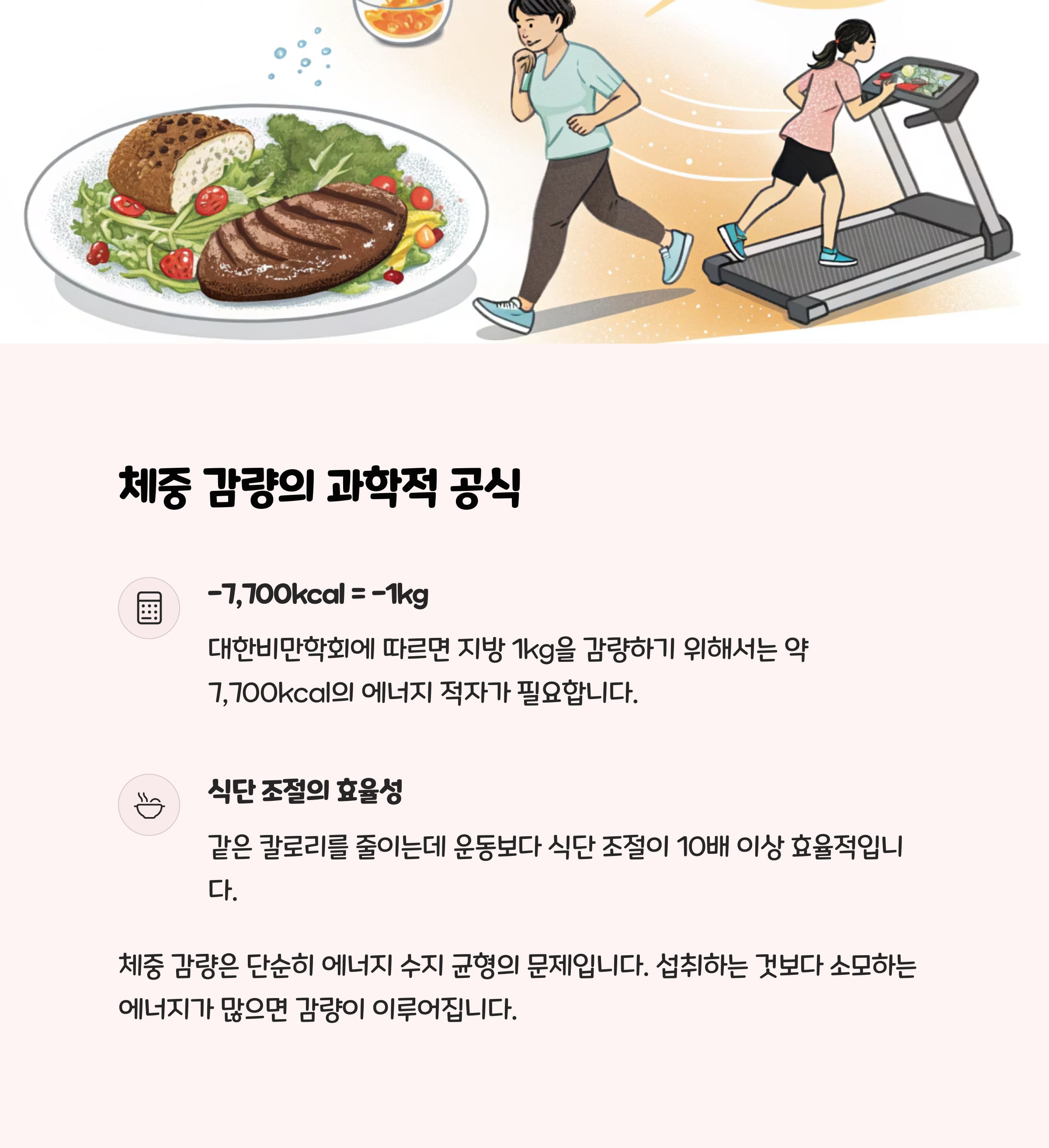 - 운동만으로 체중 감량을 시도할 경우, 실제로 소모할 수 있는 칼로리가 생각보다 적고, 꾸준히 지속하기 어렵다는 한계가 있습니다.