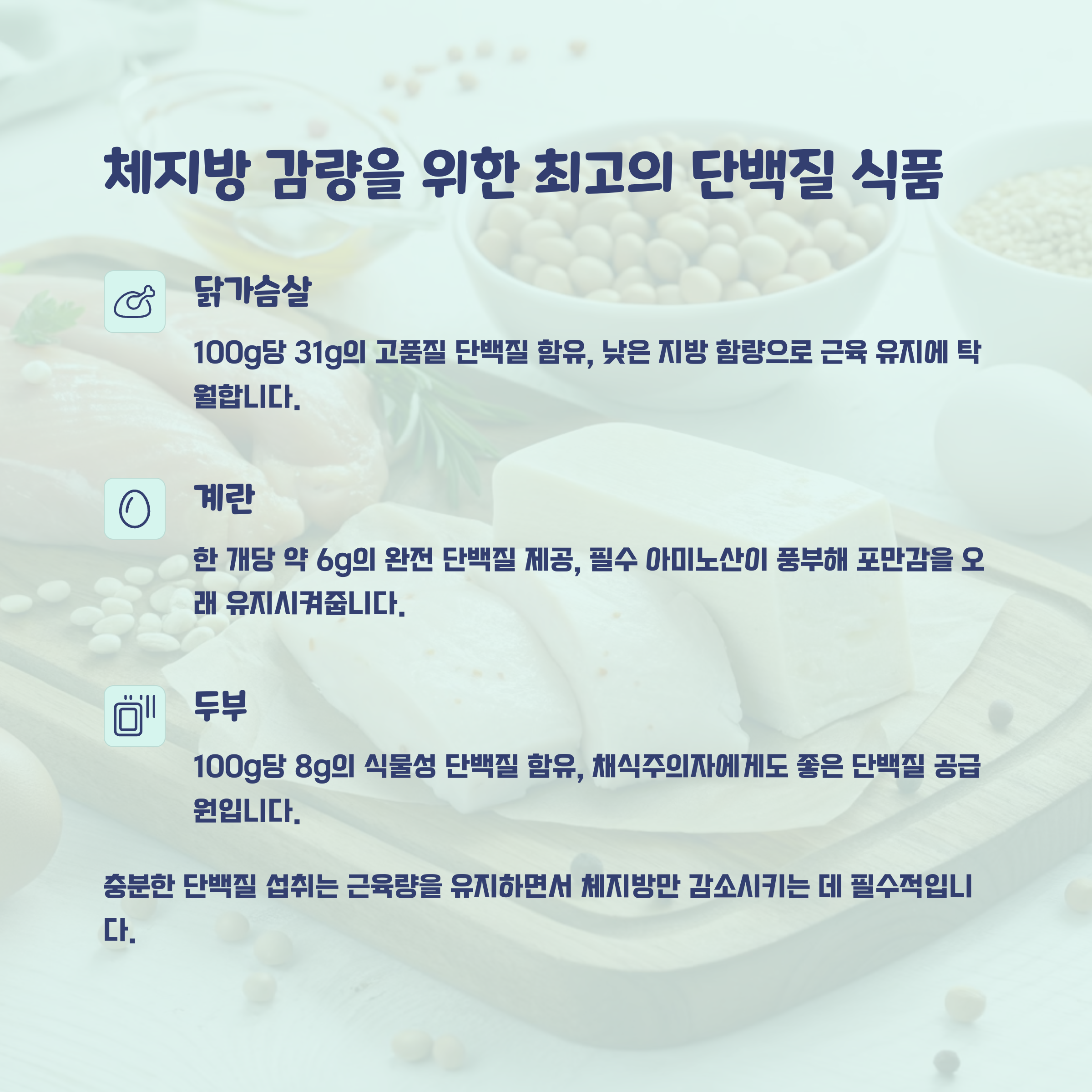 단백질은 근육량 유지와 체지방 감량에 중요한 역할을 합니다. 대표적인 고단백 저지방 식품으로는 닭가슴살, 계란, 두부 등이 있으며, 이들은 포만감을 오래 유지시키는 데도 도움을 줍니다.