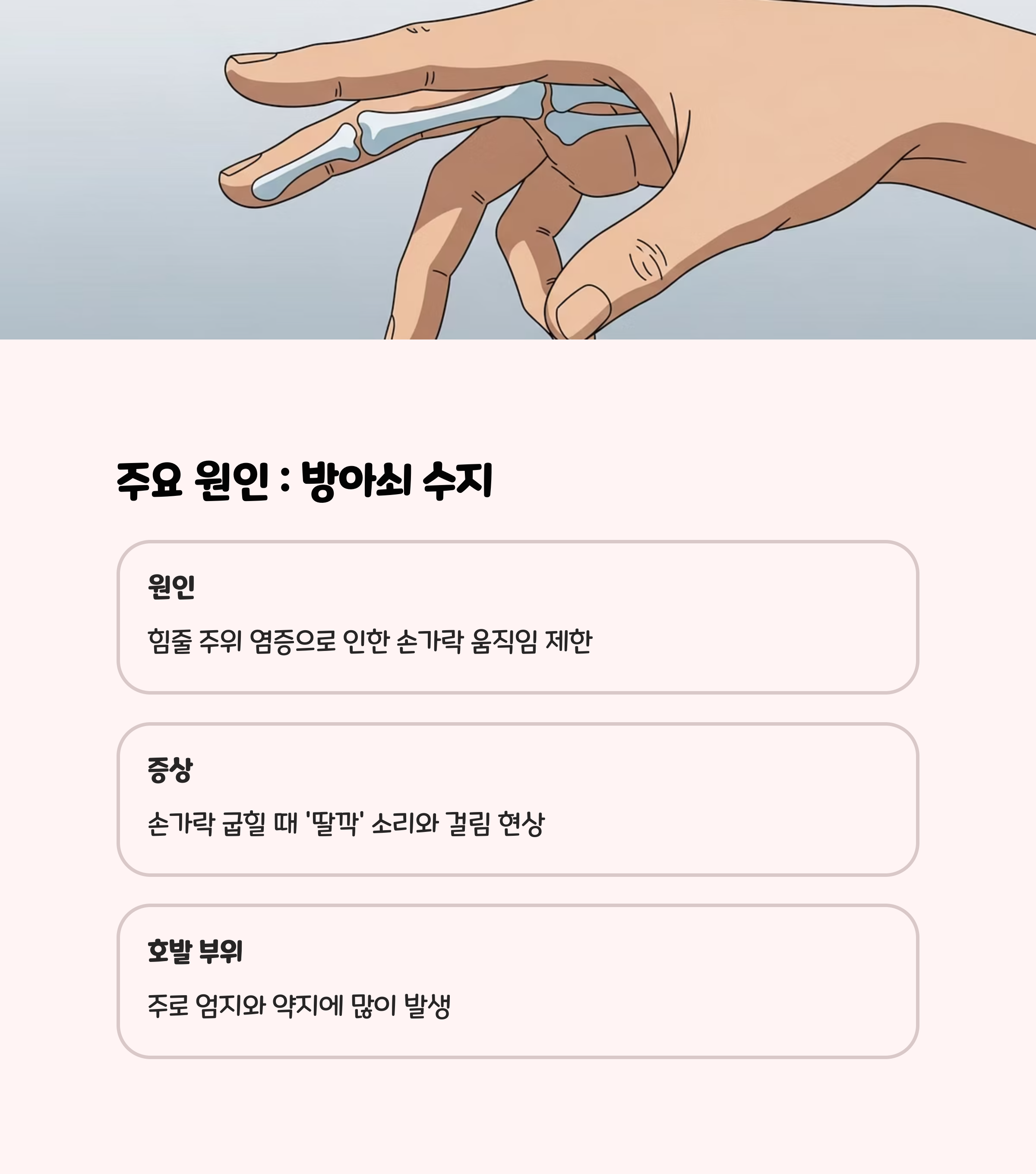 | 방아쇠 수지 | 굽힐 때 ‘딱’ 소리와 통증 | 엄지·중지·약지 흔함, 방치 시 굽힘 불편 |