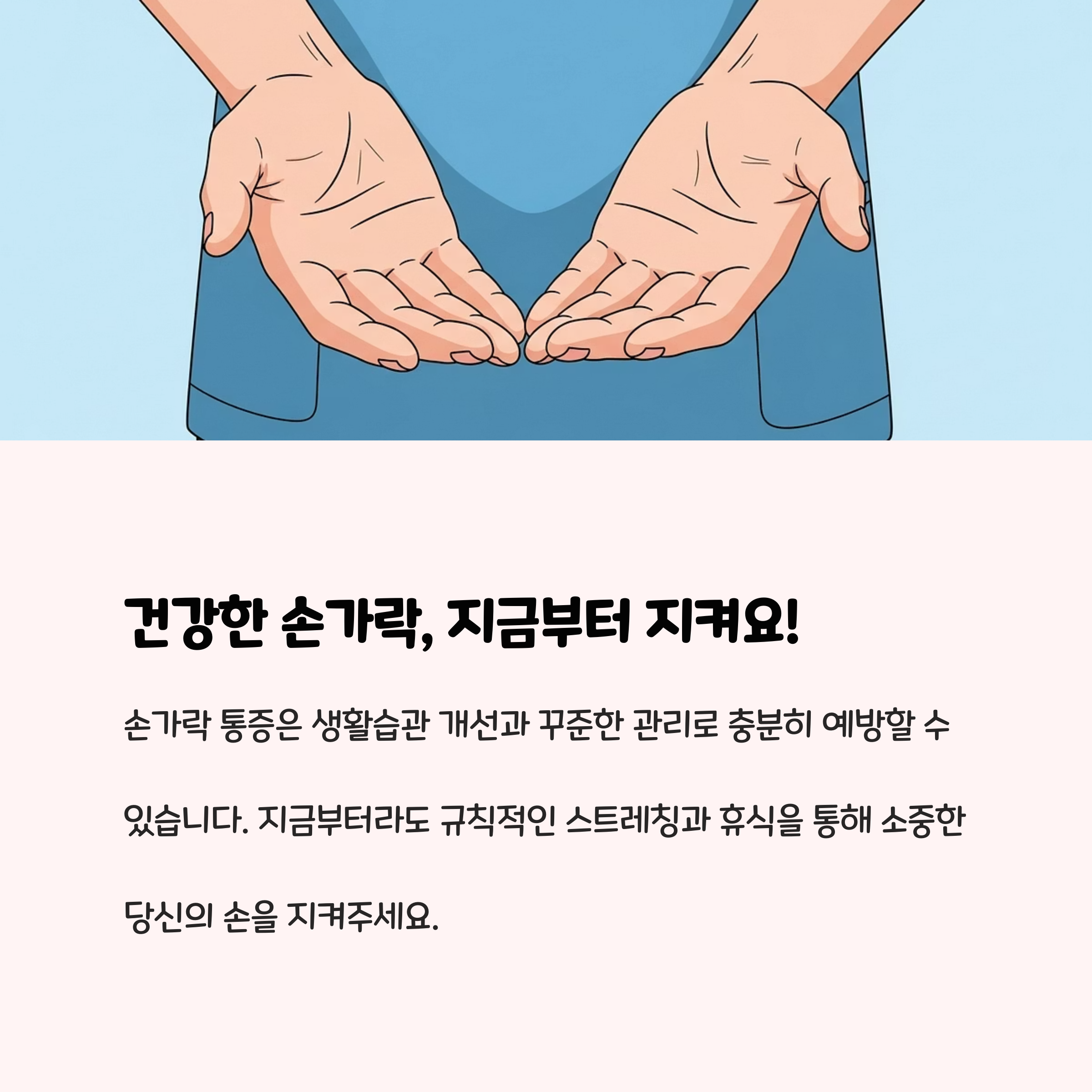 손가락 통증은 단순한 피로 증상이 아니라, 하루하루를 지치게 만드는 만성적인 고통으로 이어질 수 있습니다. 특히 가사와 육아처럼 반복적인 손 사용이 일상화된 분들에게는 가볍게 넘길 수 없는 문제이지요. 하지만 오늘 알려드린 생활 속 실천법과 예방 습관만 잘 지켜도 통증은 눈에 띄게 줄고, 건강한 손을 오래 유지할 수 있습니다.