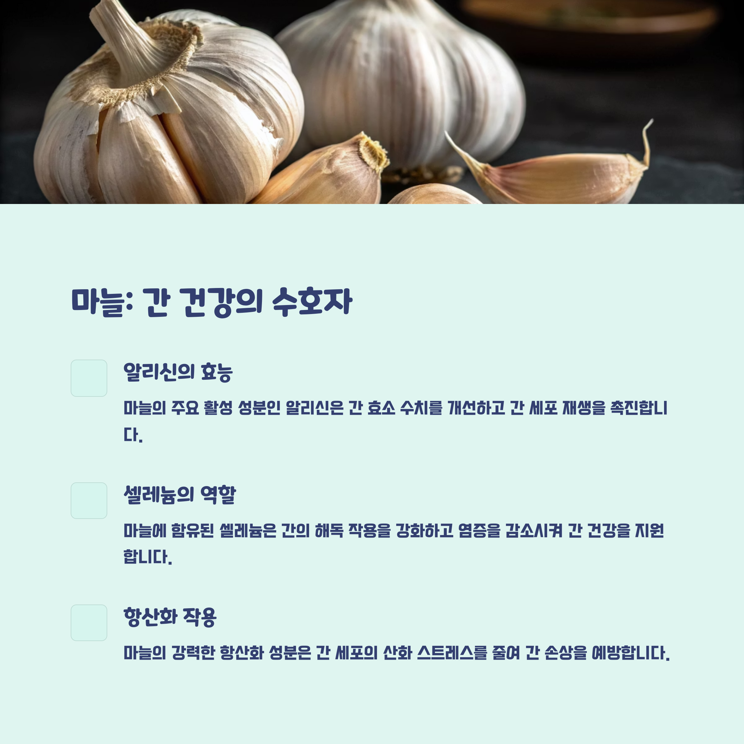 마늘은 알리신과 셀레늄 성분이 풍부하여 간 해독에 효과적입니다. 알리신은 항암 및 항균 작용이 뛰어나며, 비타민 B1과 결합하여 당 대사를 촉진하고 간 피로를 줄여줍니다. 셀레늄은 활성 산소를 제거해 면역력을 높이고, 독소 제거에도 기여합니다. 마늘은 으깨거나 다져서 조리하면 이러한 성분의 흡수율이 더욱 높아집니다.