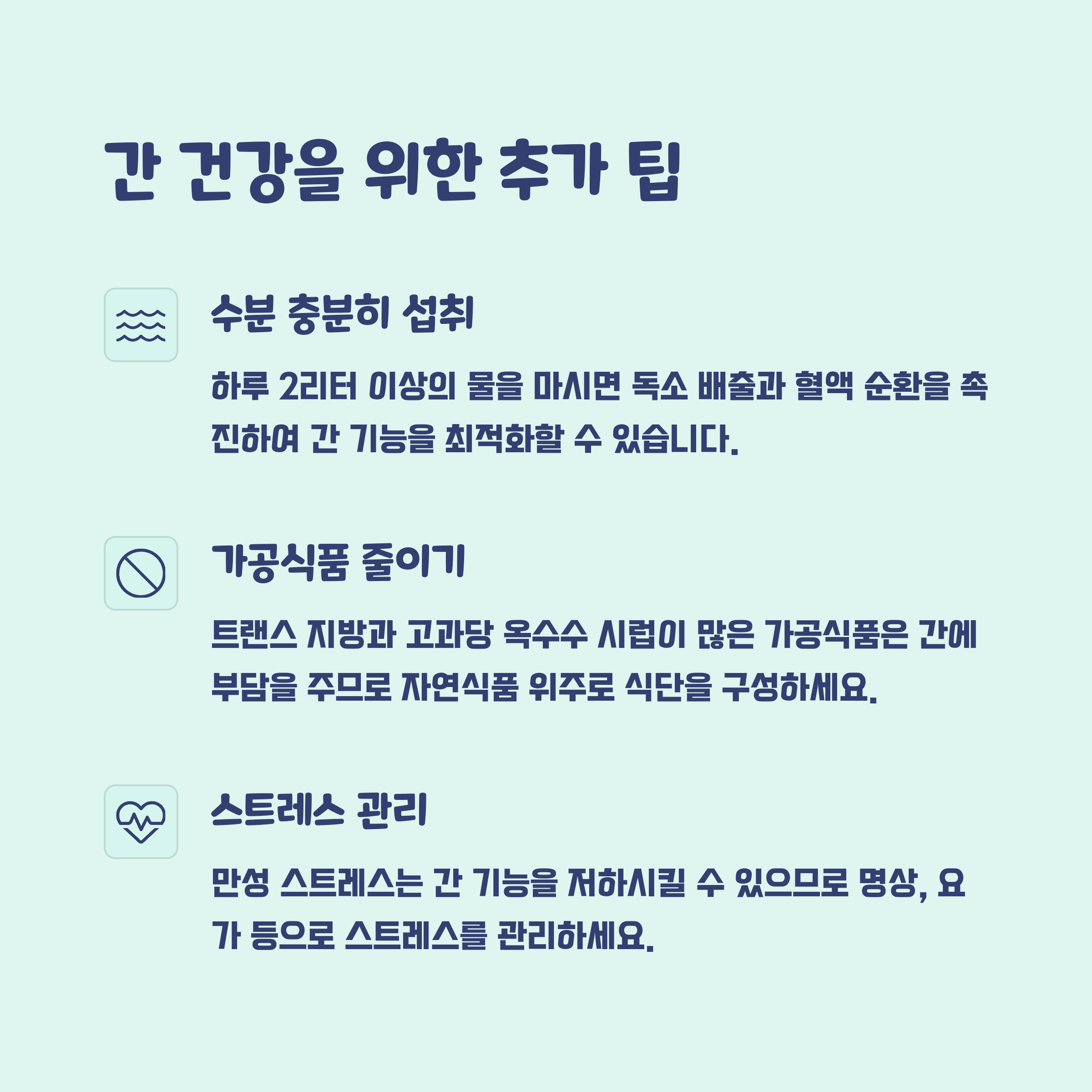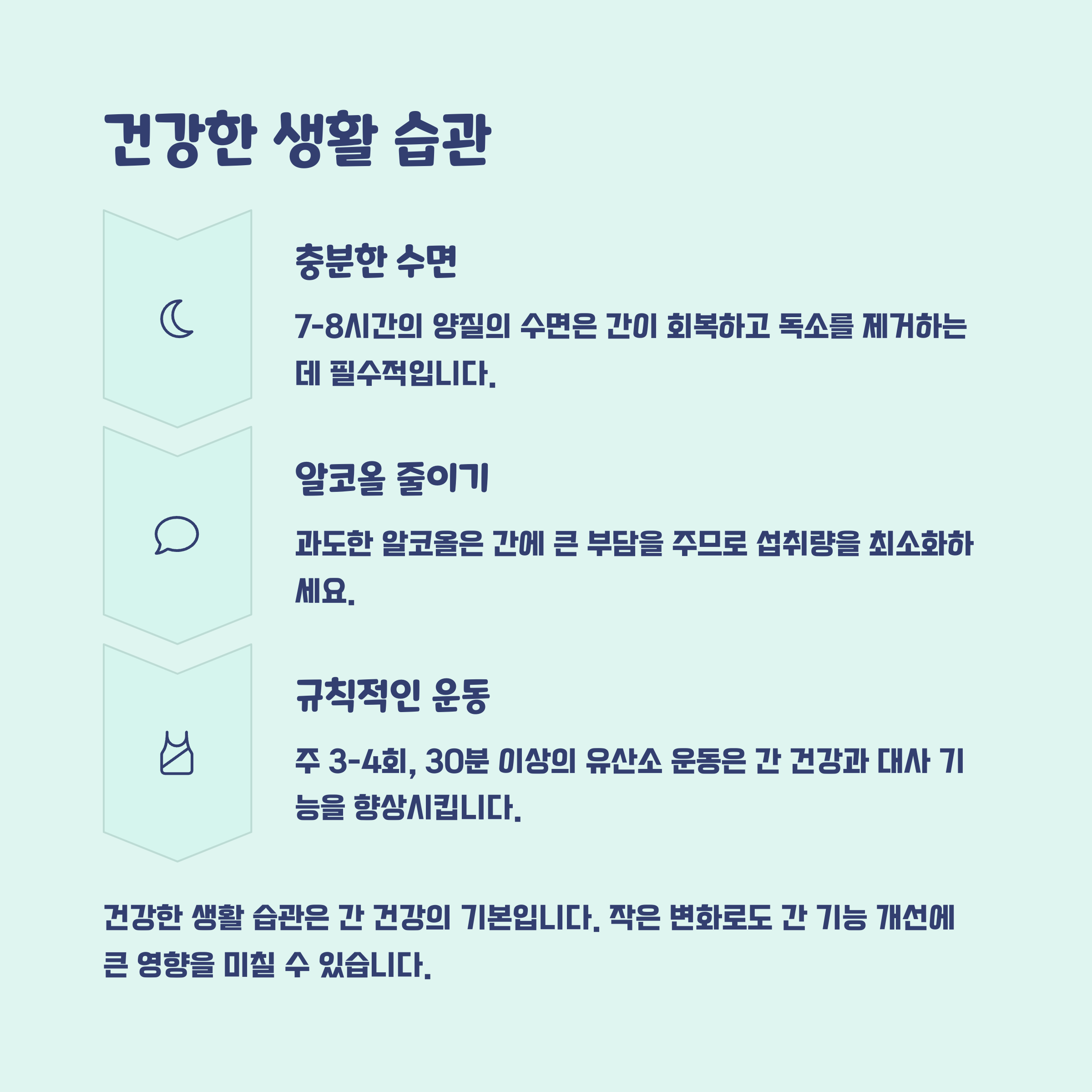 간 건강을 유지하려면 위 식품들을 규칙적으로 섭취하는 것 외에도 다음과 같은 생활 습관을 실천하는 것이 중요합니다.