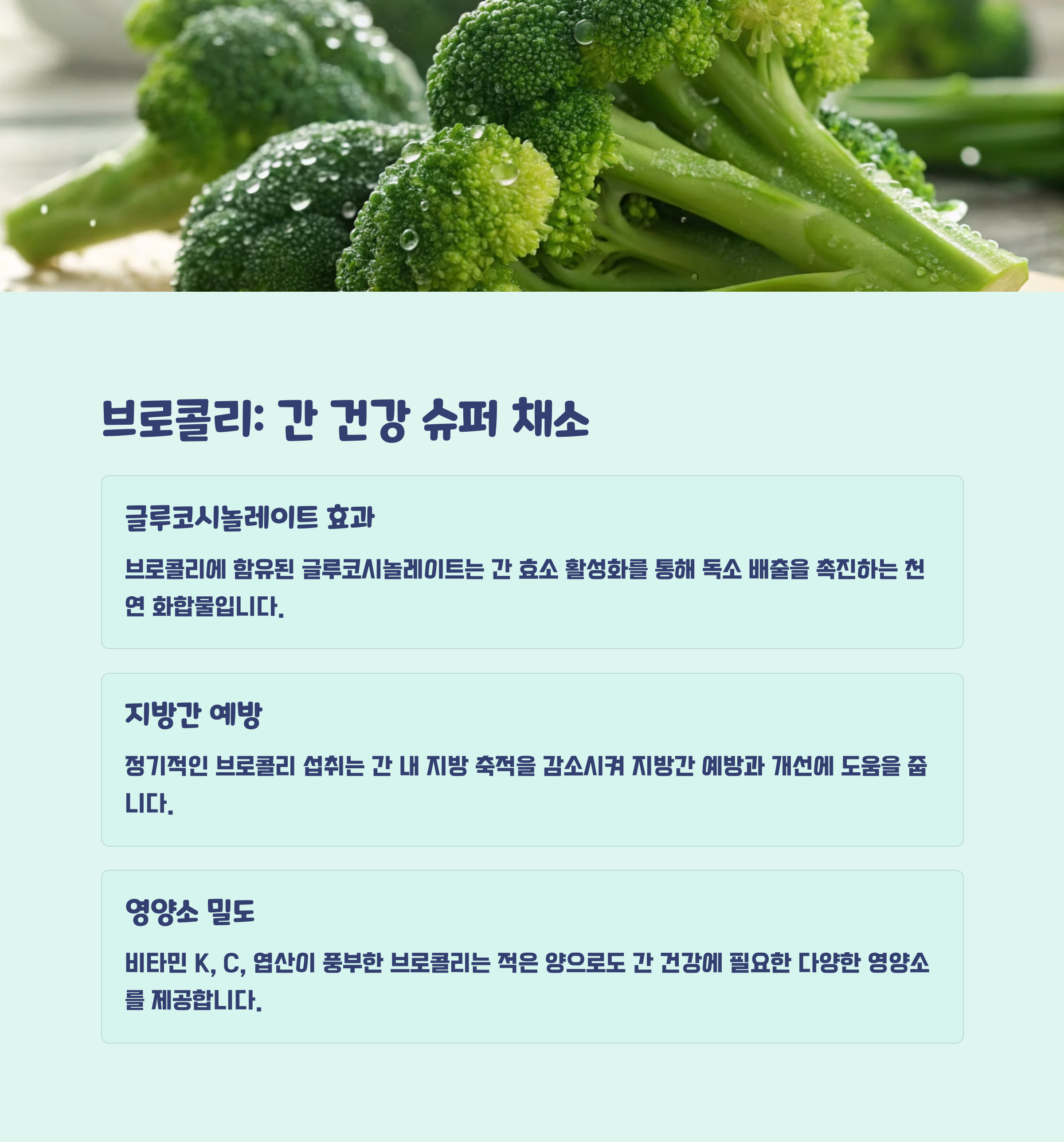 브로콜리는 글루코시놀레이트 성분이 풍부한 십자화과 채소로, 간 해독 효소를 증가시켜 독소 배출을 돕습니다. 이 성분은 항암 작용도 있어 전반적인 건강 증진에 기여합니다. 브로콜리를 포함한 양배추, 콜리플라워 등 배춧과 채소는 지방 흡수를 줄이고 지방간 예방에도 효과적입니다.