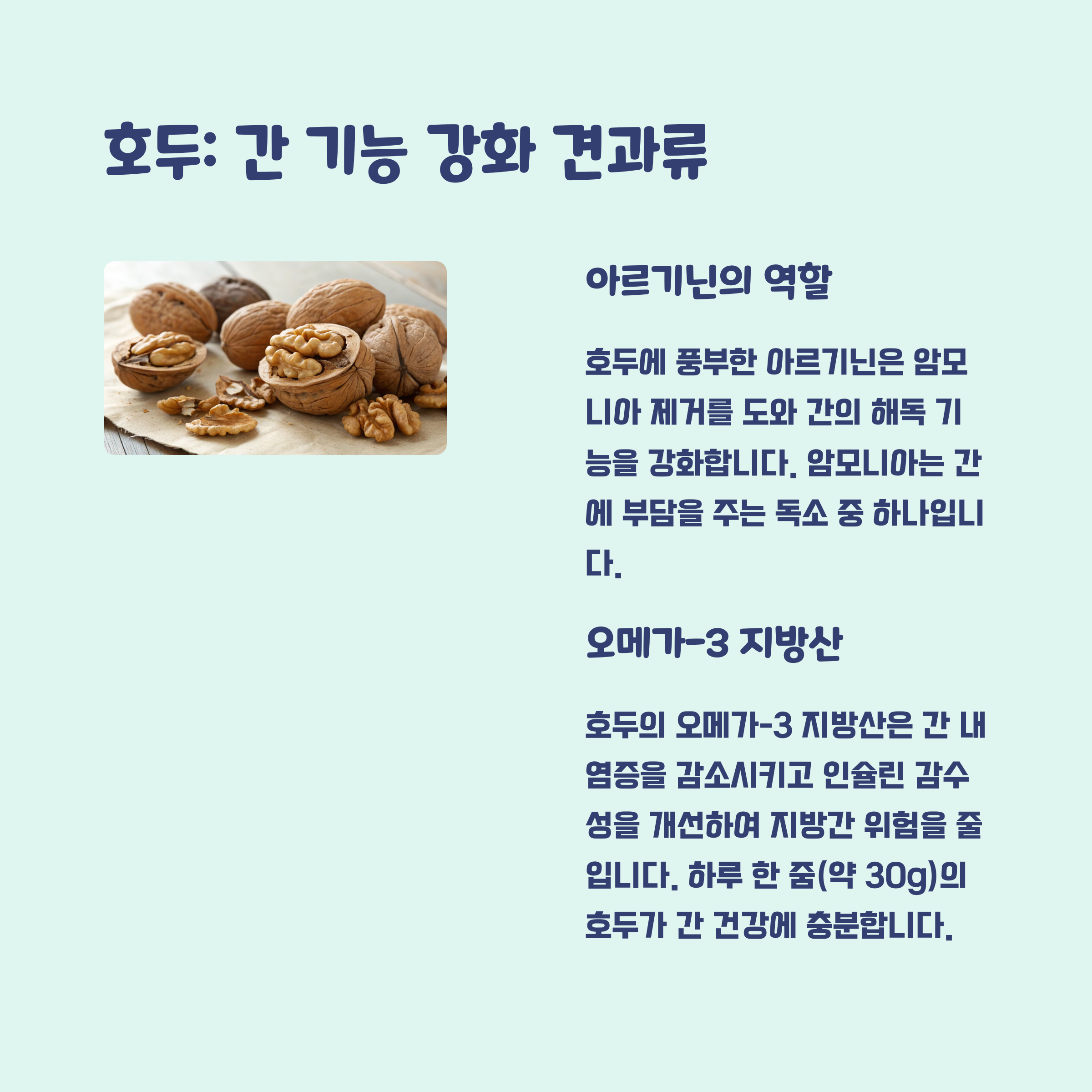 호두는 아르기닌이라는 아미노산이 포함되어 있어 암모니아 제거를 돕습니다. 또한 오메가-3 지방산과 글루타티온도 풍부하여 간의 해독 작용을 강화합니다. 견과류는 하루 적정량 섭취하면 간 건강뿐만 아니라 심혈관 건강에도 긍정적인 영향을 미칩니다.