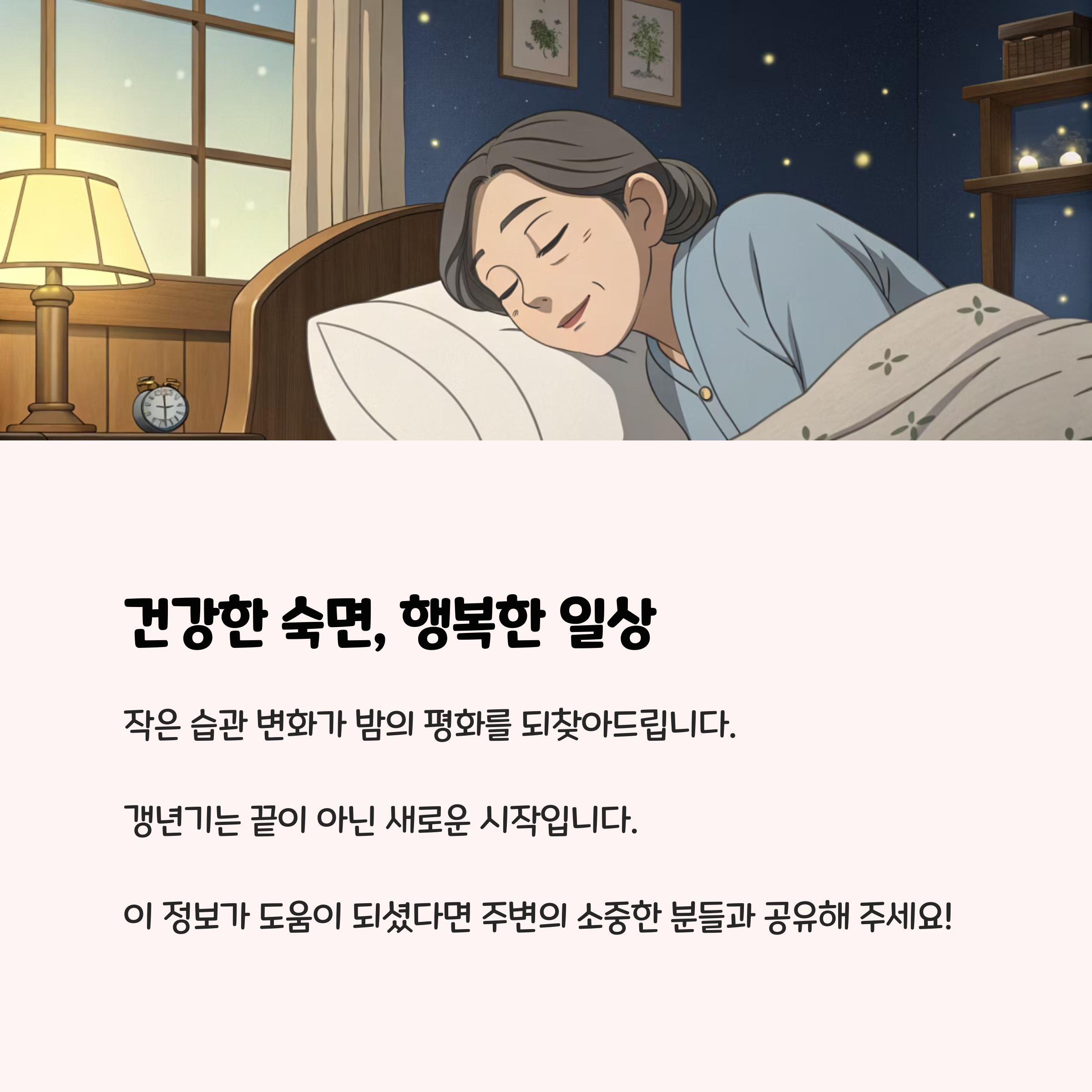 갱년기 여성의 수면장애와 야간뇨는 단순한 노화 현상이 아니라, 생활습관 개선과 자연치유법을 통해 충분히 관리할 수 있는 증상입니다. 하루 1~1.5리터 물 섭취, 저녁 이후 수분 제한, 족욕과 운동, 방광 근육 강화, 수면 환경 개선 등 작은 실천이 숙면과 건강한 일상으로 이어집니다. 증상이 심할 땐 반드시 전문가 상담을 받으세요. 지금 바로 실천하는 생활습관 변화가 내일의 건강을 지킵니다!