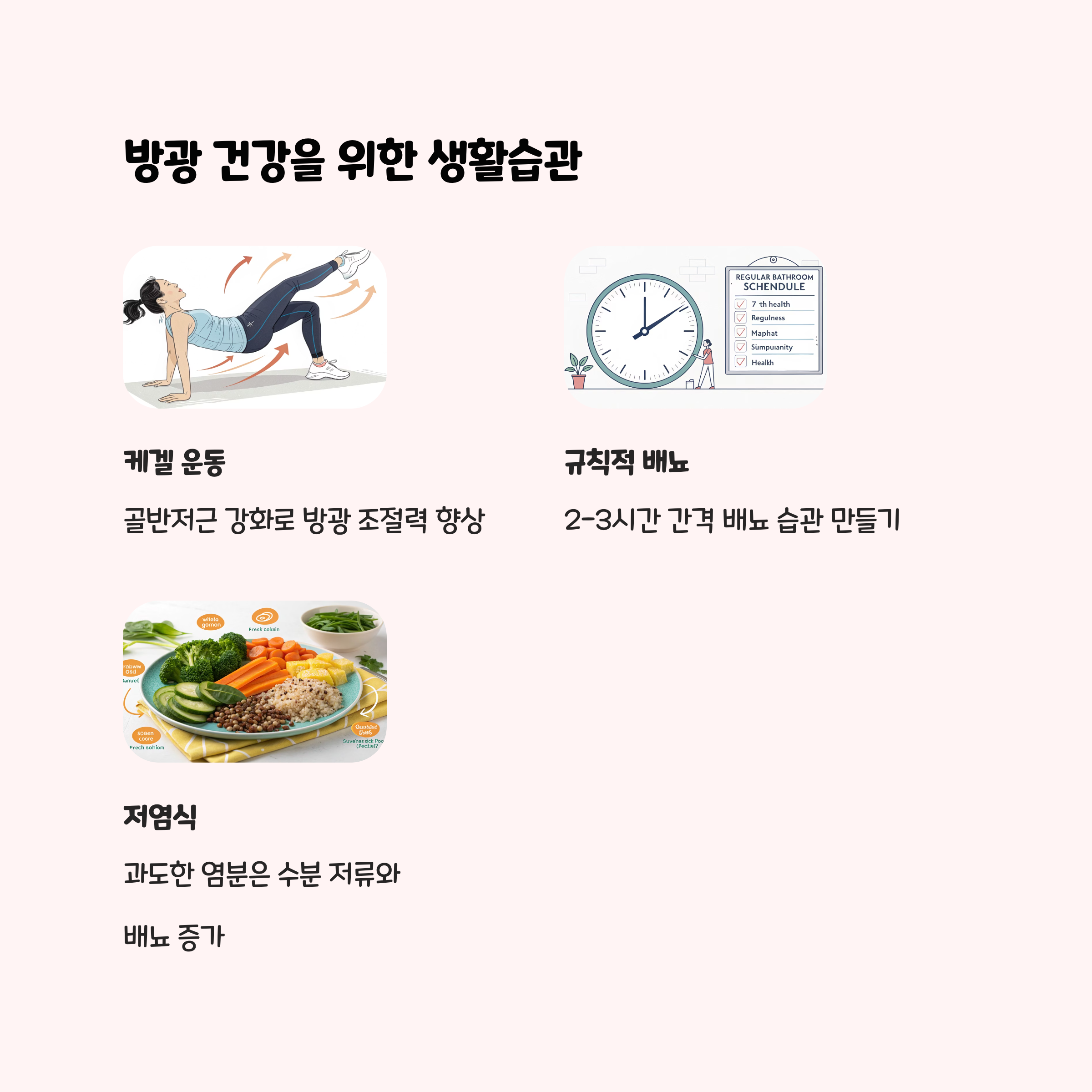 - 케겔 운동이나 방광 훈련(10분 참았다가 소변보기)도 배뇨 조절에 도움이 됩니다.