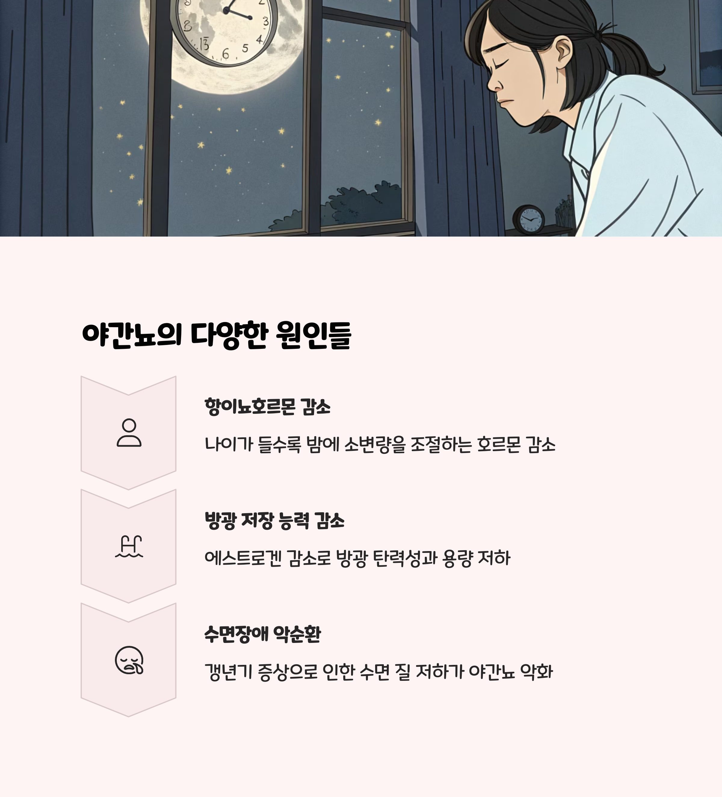 야간뇨는 밤에 소변을 보기 위해 1회 이상 잠에서 깨는 증상입니다. 갱년기에는 방광 근육이 약해지고, 호르몬 변화로 소변 농축 능력이 떨어지며, 과민성 방광 증상이 동반되어 야간뇨가 더 자주 발생하게 됩니다.