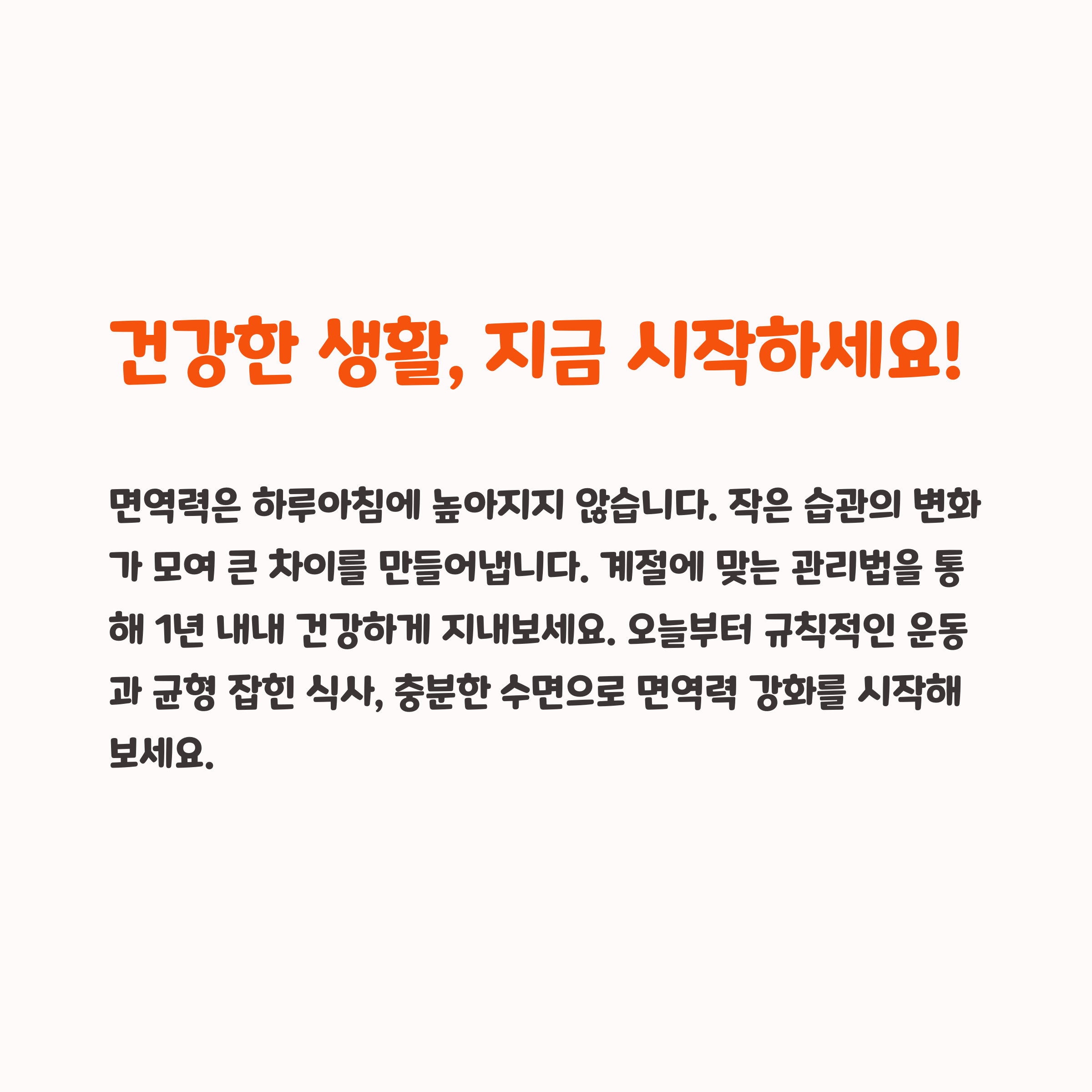 계절에 따라 적절한 영양 섭취와 규칙적인 운동, 충분한 수면은 필수입니다. 특히 면역력을 높이기 위해서는 꾸준한 습관 관리가 중요합니다. 작은 변화들이 모여 결국 건강한 몸을 만드는 법! 오늘부터 바로 실천해 보세요.