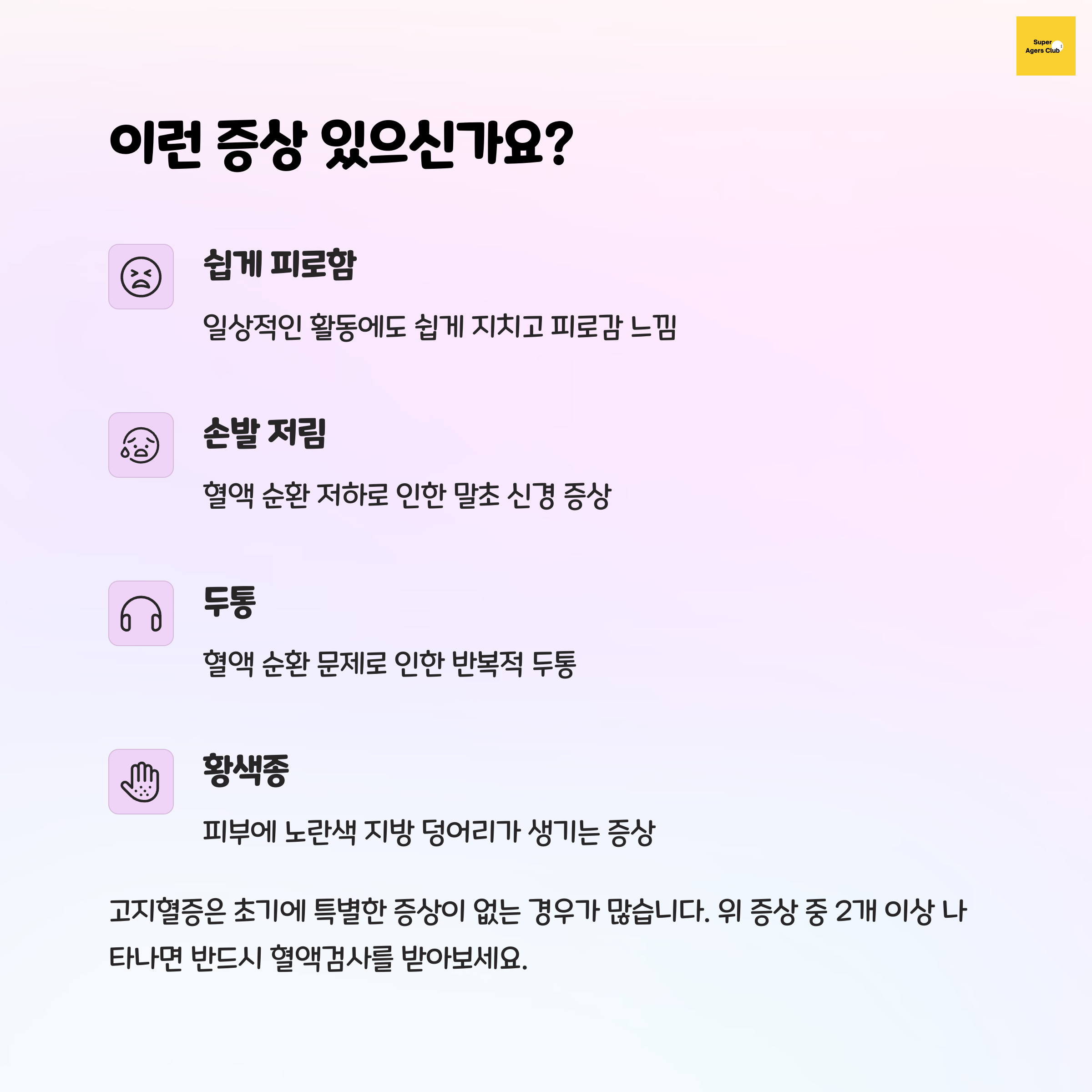 고지혈증의 가장 큰 위험은 초기에는 거의 증상이 없다는 점입니다. 실제로 ‘소리 없는 병’이라 불릴 정도로, 혈액 검사 없이는 자신의 상태를 알기 어렵습니다. 하지만 혈관이 점차 막히기 시작하면 다양한 신체 이상이 서서히 나타납니다.