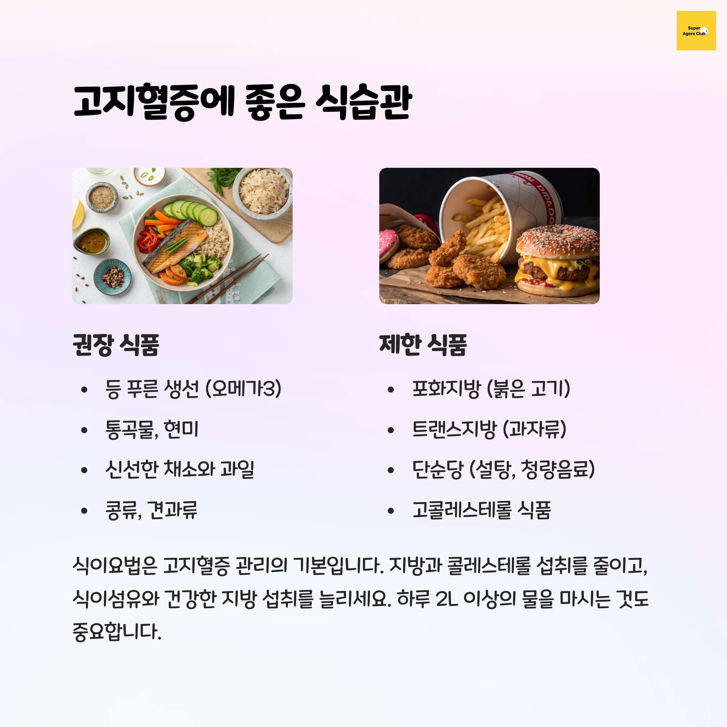 고지혈증은 혈액 내 콜레스테롤과 중성지방이 정상 범위를 넘어 과도하게 축적된 상태를 의미합니다. 유전적 요인, 잘못된 식습관, 운동 부족, 스트레스 등이 주요 원인입니다. 고지혈증이 오래 지속되면 혈관 벽에 지방이 쌓여 동맥경화, 심근경색, 뇌졸중 등 심각한 혈관 질환으로 발전할 수 있습니다.