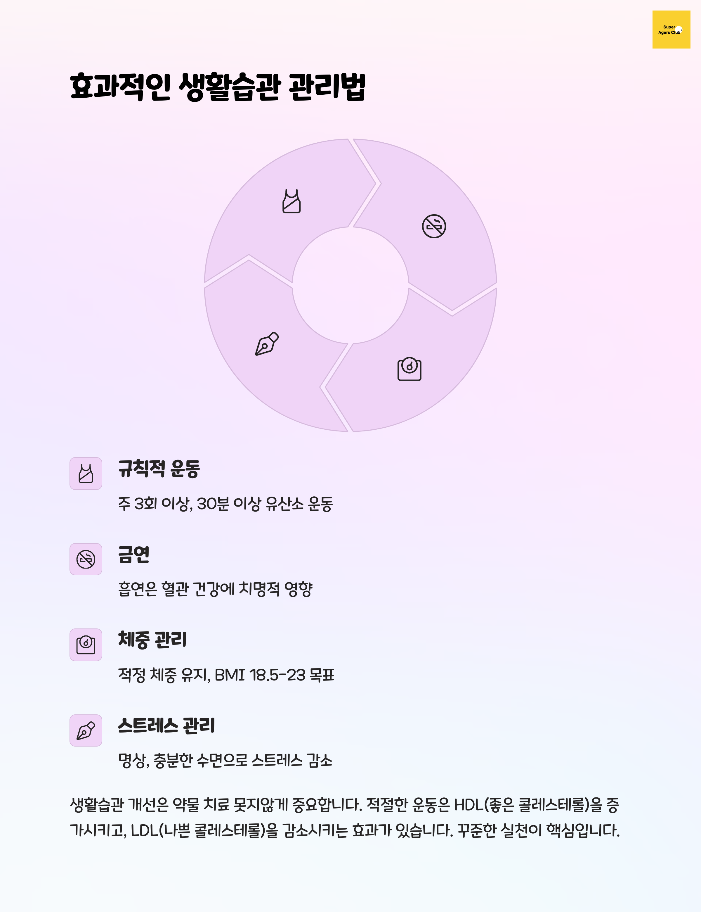 - 금연·절주 : 흡연과 과음은 콜레스테롤 수치를 악화시킴