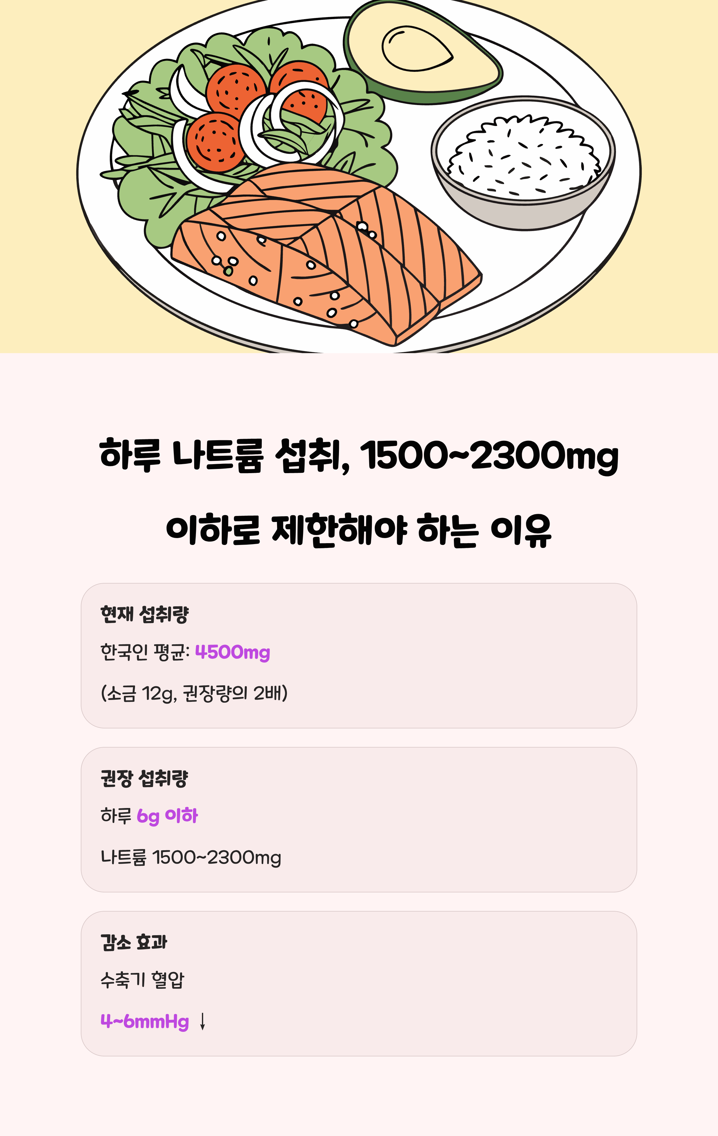 - 연구에선 나트륨 섭취를 2000mg 이하로 유지했을 때 수축기 혈압이 평균 6.8mmHg, 이완기 혈압이 3.7mmHg 감소한 것으로 확인되었습니다.
