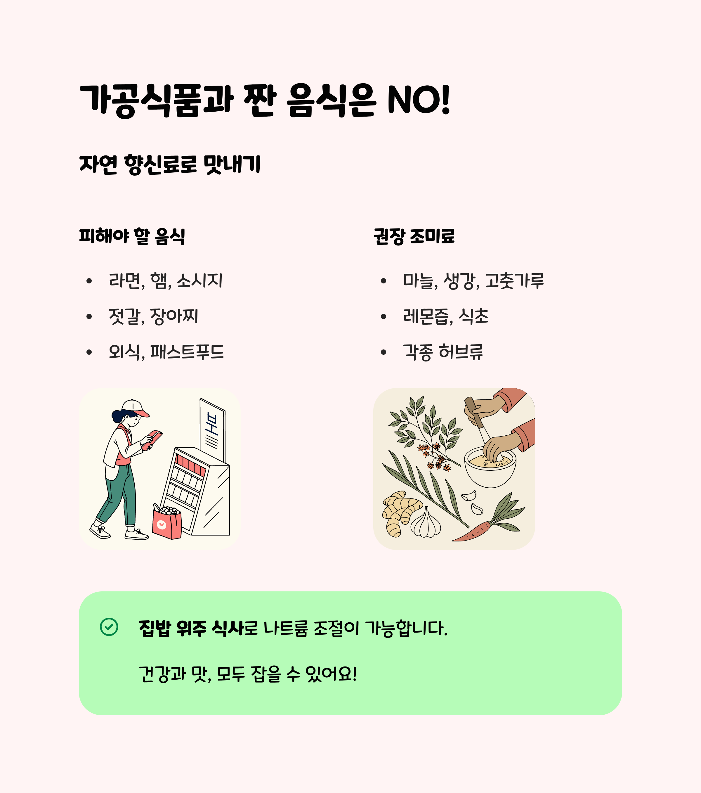 - 소금 대신 마늘, 후추, 허브, 레몬즙 등 자연 향신료로 맛을 조절하면 나트륨 섭취를 줄일 수 있습니다.