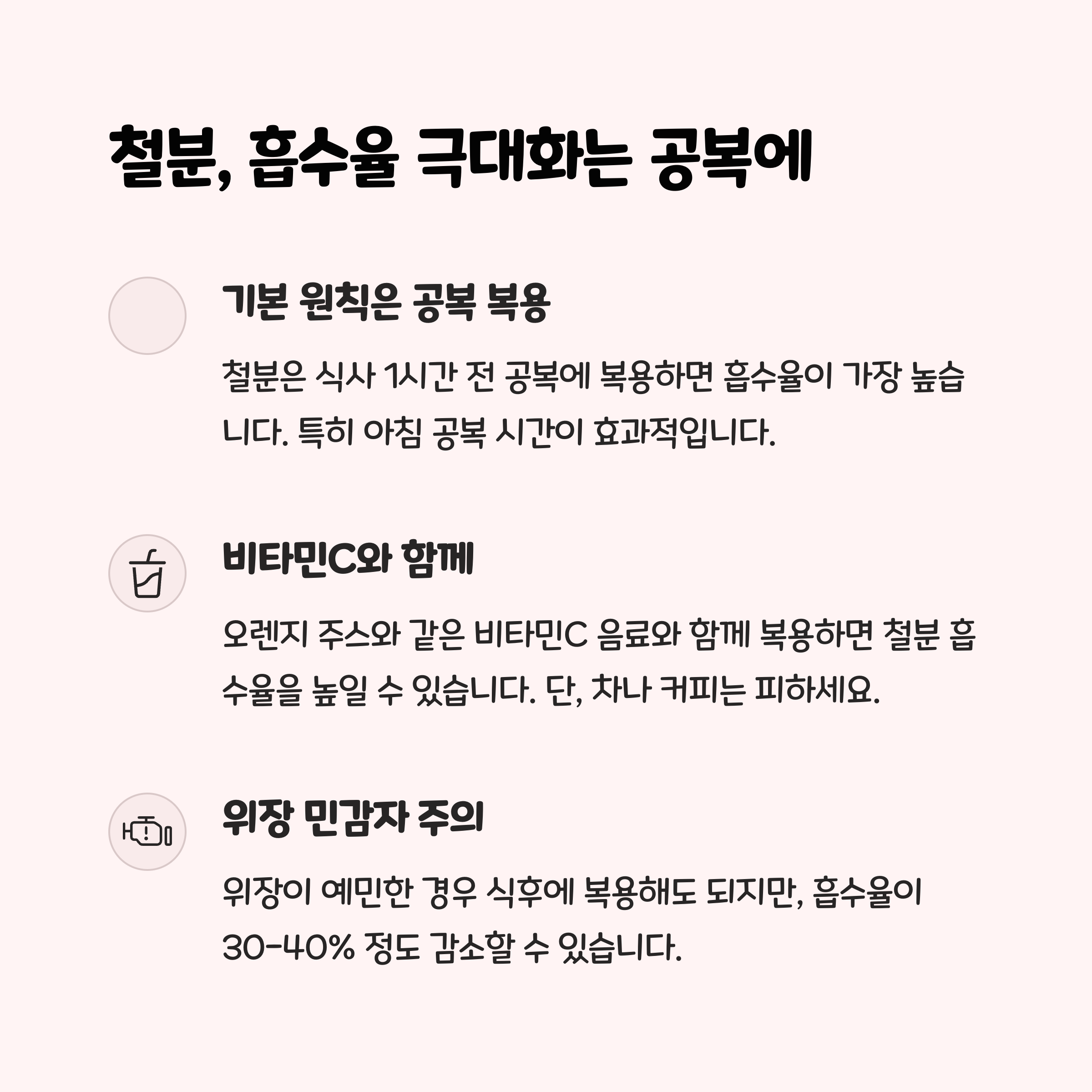 - 철분 : 무기염 철분(황산철, 푸마르산철 등)은 공복에 복용해야 흡수율이 높아집니다. 다만, 위장 장애가 있다면 식후 복용을 권장합니다.