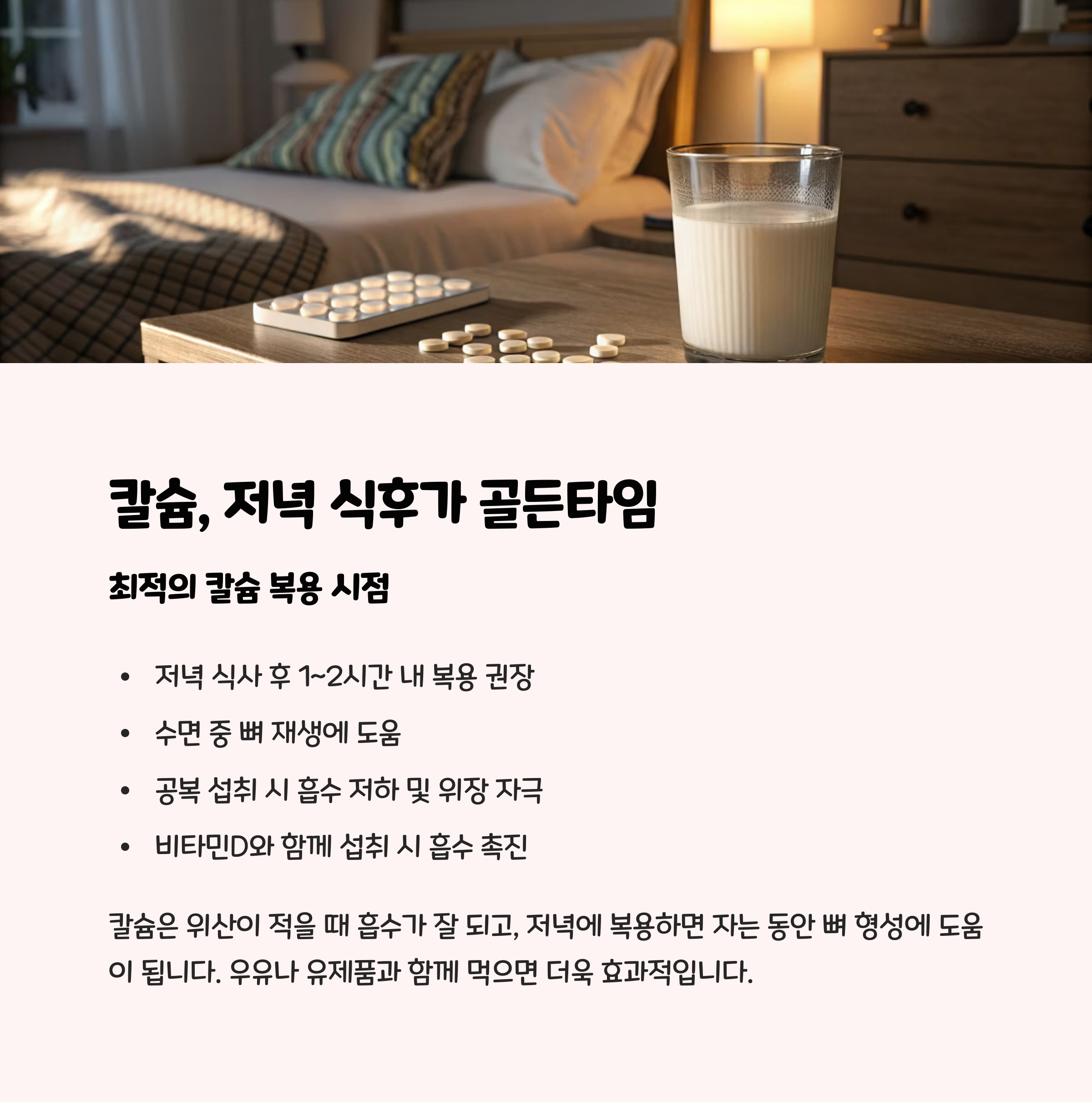 칼슘은 위산이 충분히 분비된 상태에서 흡수율이 가장 높아집니다. 공복에는 위산 분비가 적어 흡수가 잘 되지 않을 뿐 아니라, 변비나 위장 장애를 유발할 수 있습니다. 저녁 식사 후에 복용하면 숙면에도 도움이 됩니다.