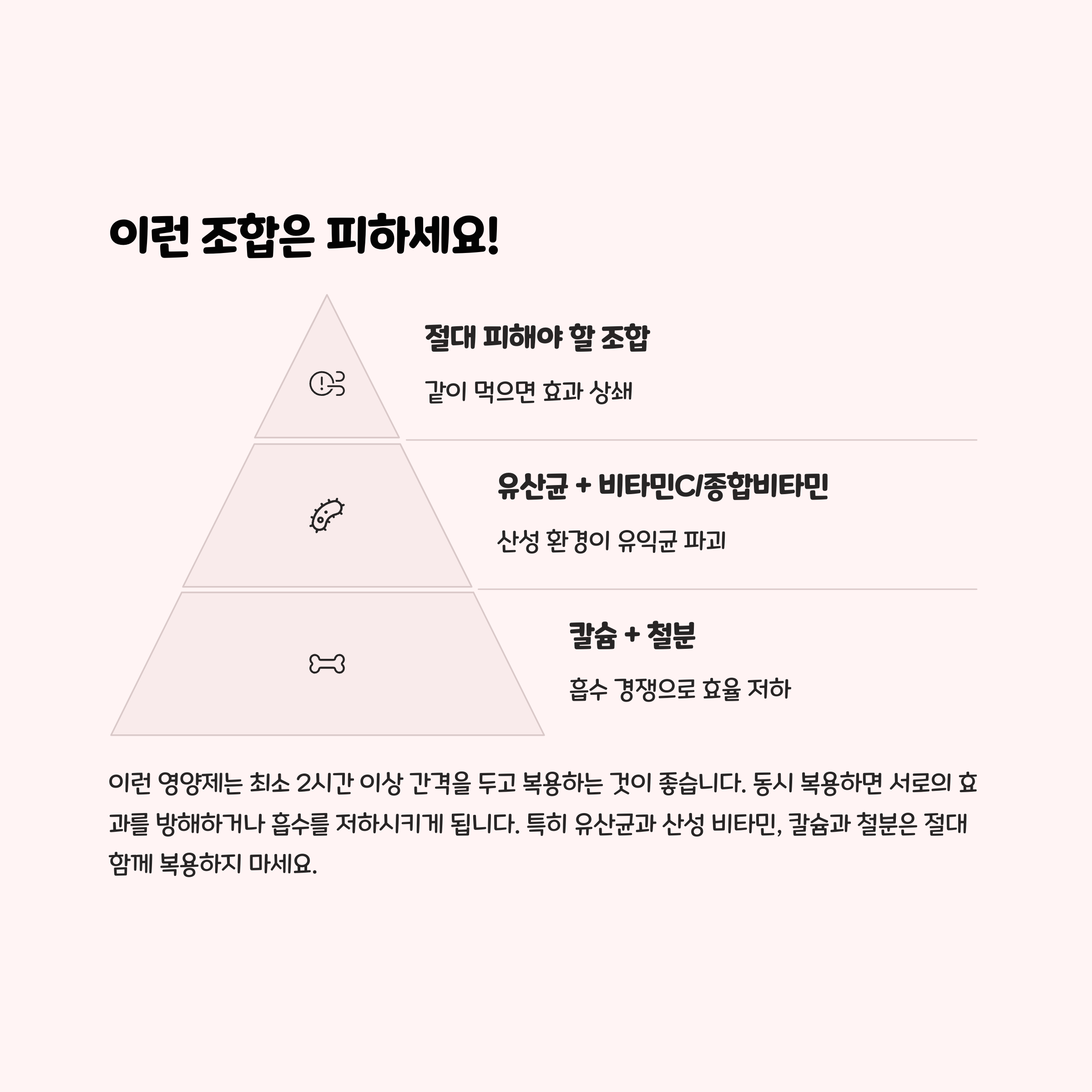 - 철분과 칼슘을 동시에 복용하면 철분 흡수가 크게 저하됩니다. 반드시 2시간 이상 간격을 두고 복용해야 합니다.