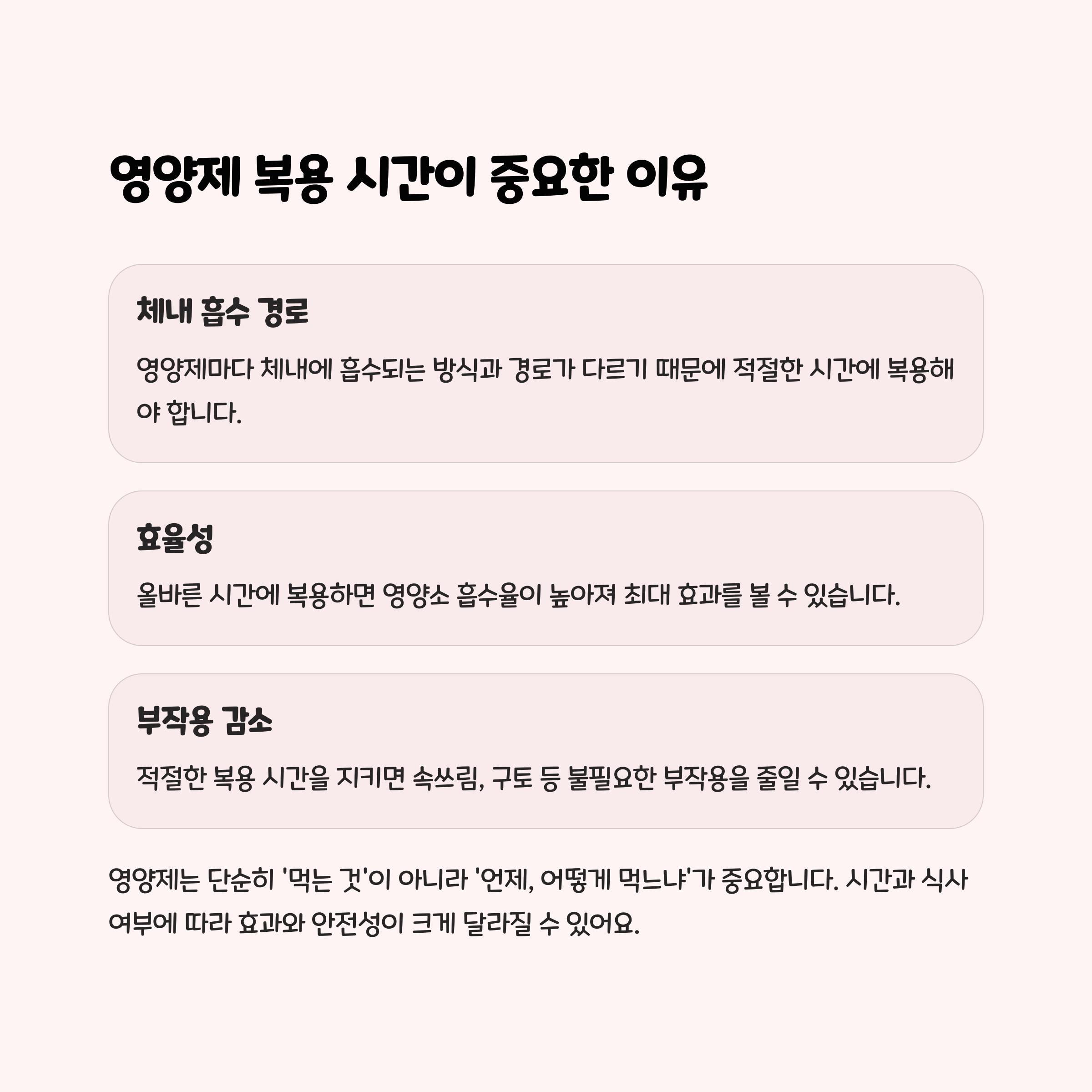 - 위장 장애가 있는 분들은 공복 복용이 권장되는 영양제도 식후에 복용하는 것이 안전할 수 있습니다.