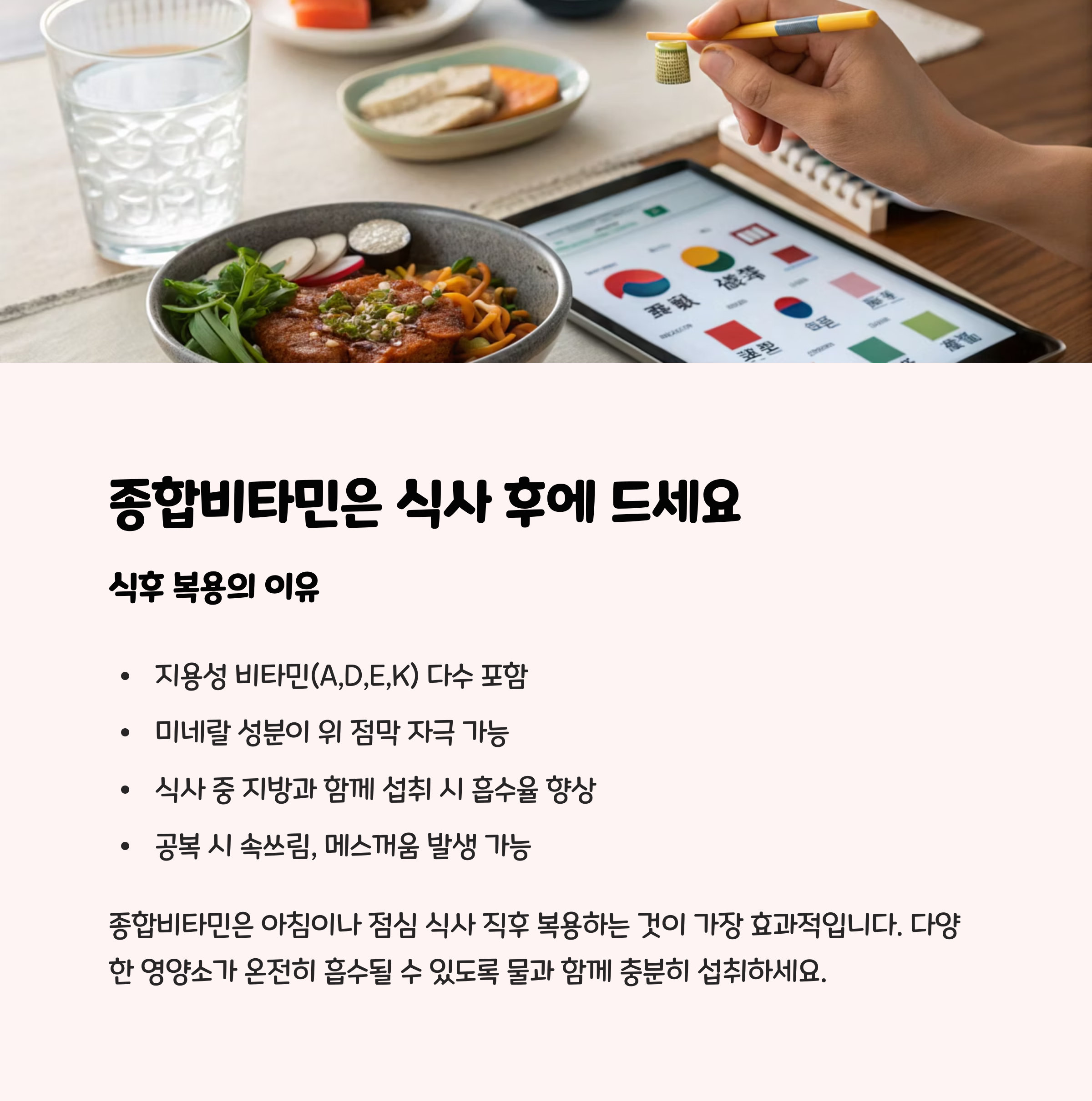 종합비타민에는 비타민 A, D, E 등 지용성 성분이 다수 포함되어 있습니다. 이들 비타민은 지방과 함께 섭취해야 흡수율이 높아지며, 공복에 먹을 경우 흡수가 제대로 되지 않을 뿐 아니라 속쓰림, 메스꺼움 등 위장 장애를 유발할 수 있습니다. 실제로 WebMD 등 해외 건강 포털에서도 종합비타민은 반드시 식사와 함께 복용할 것을 권장합니다.