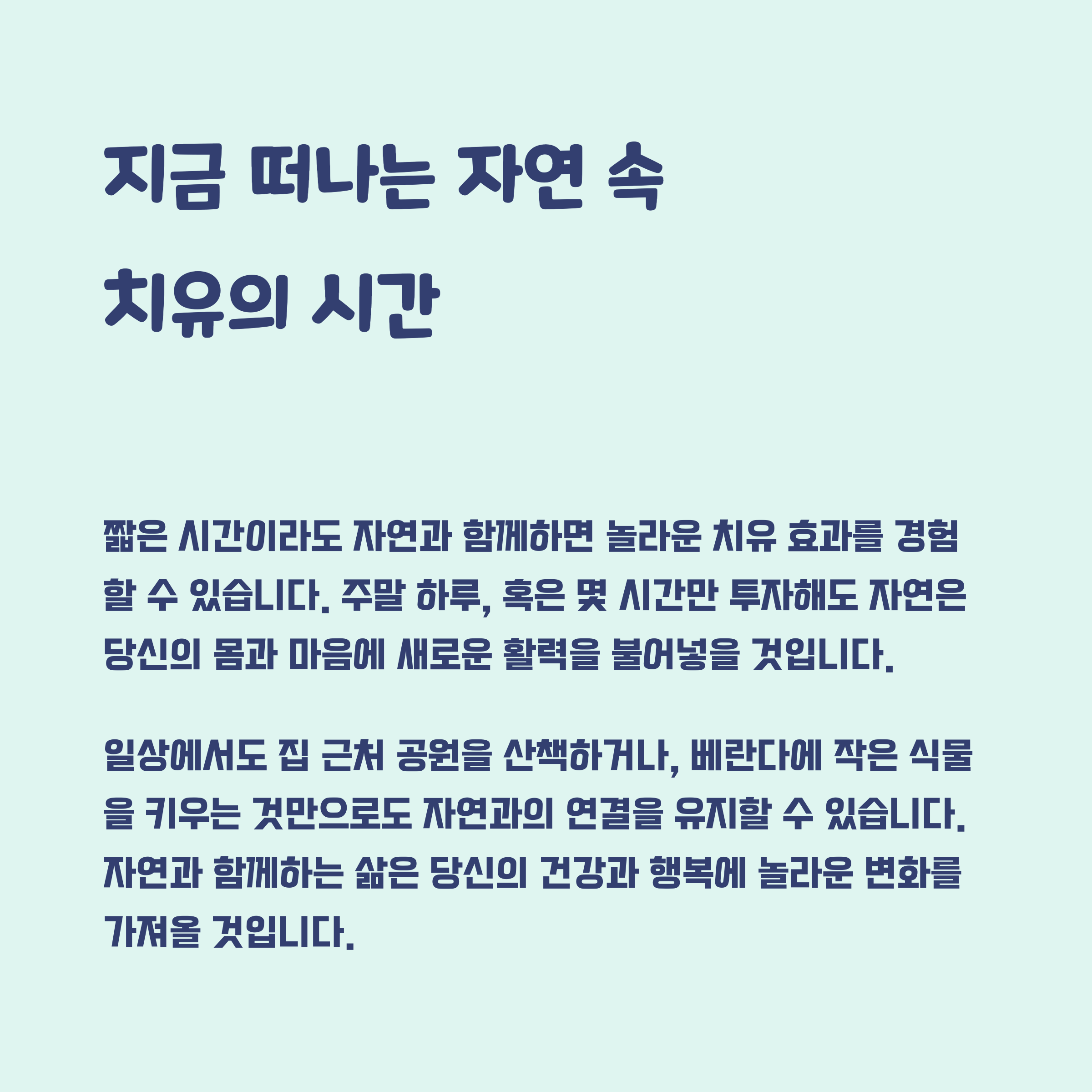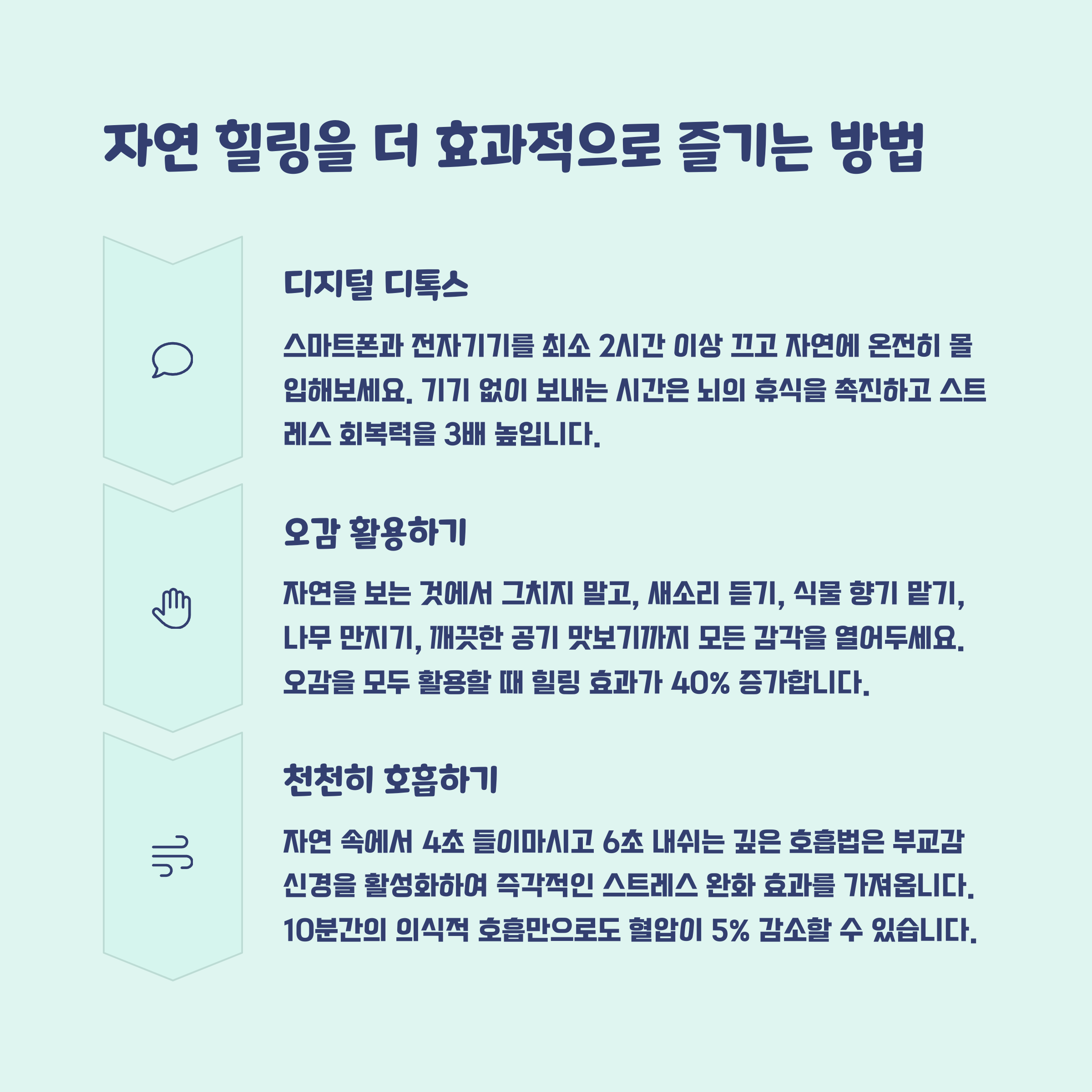 지친 일상에서 벗어나 자연이 주는 치유 효과를 직접 경험해보세요. 위에서 소개한 명소들은 과학적으로 검증된 힐링 효과와 함께 특별한 추억까지 선사할 것입니다. 지금 당장 가벼운 마음으로 떠나보세요!