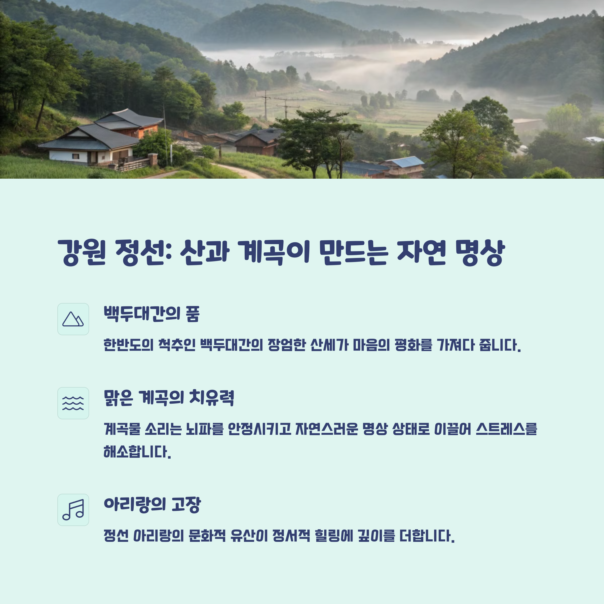 강원도 정선은 한적한 시골 마을로, 맑은 공기와 고요한 풍경이 지친 현대인들에게 안식처를 제공합니다. 정선의 대표적인 명소인 아우라지 강변에서는 물소리를 들으며 여유로운 산책을 즐길 수 있습니다. 이곳에서의 느긋한 시간은 심리적 안정과 함께 도시 생활에서 벗어난 자유로움을 선사합니다.