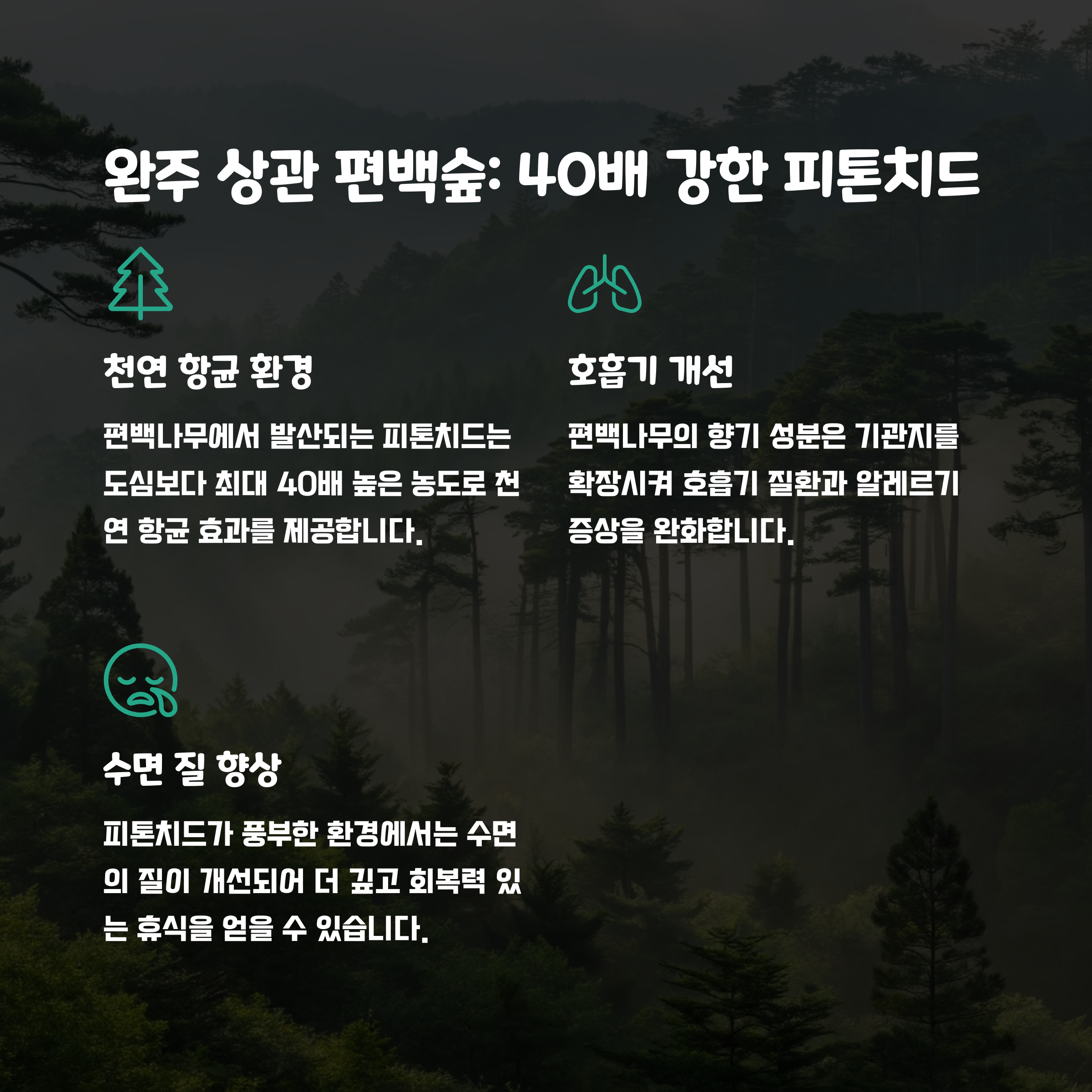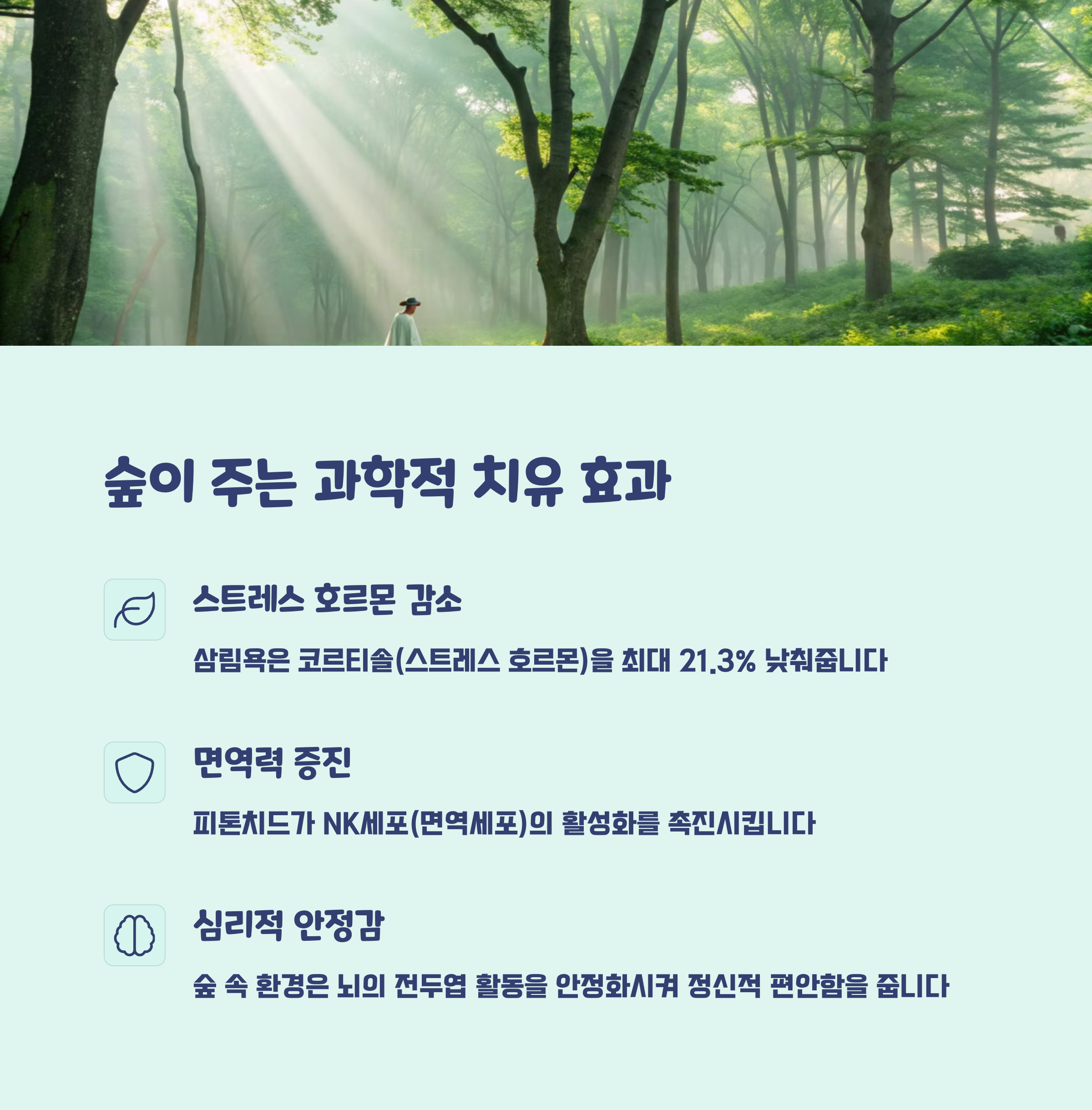 • 면역력 향상: 피톤치드 흡수를 통한 NK세포 활성화