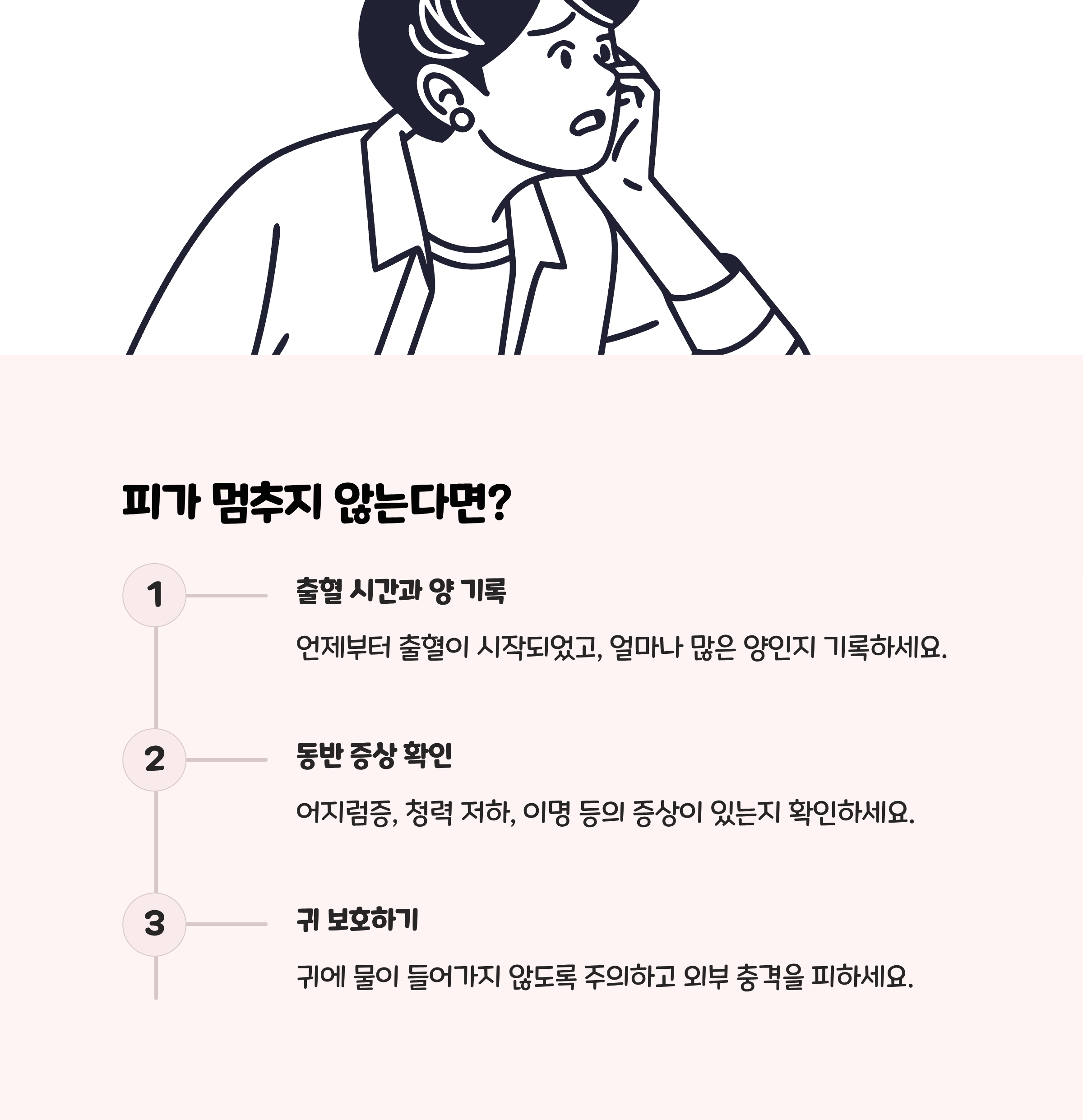 증상 발생 시간, 피의 양·색, 동반 증상(청력 저하, 열 등)을 관찰하세요.