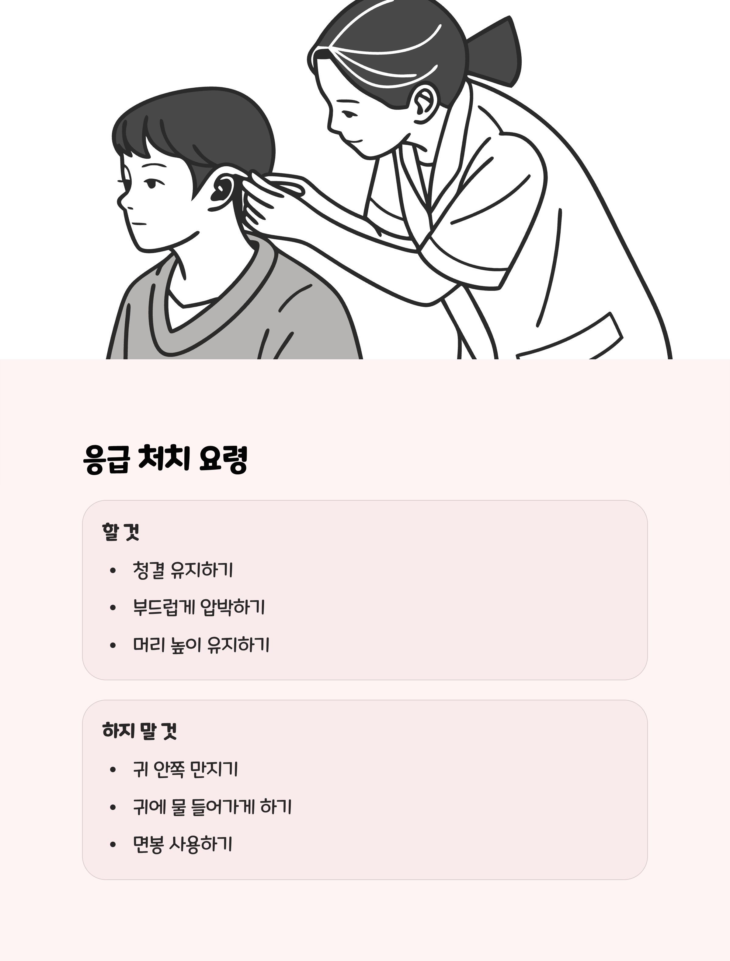 | 귀 만지지 말기 | 외상 및 감염 악화 가능성 높음 | 내이염, 고막 손상 악화 우려 |