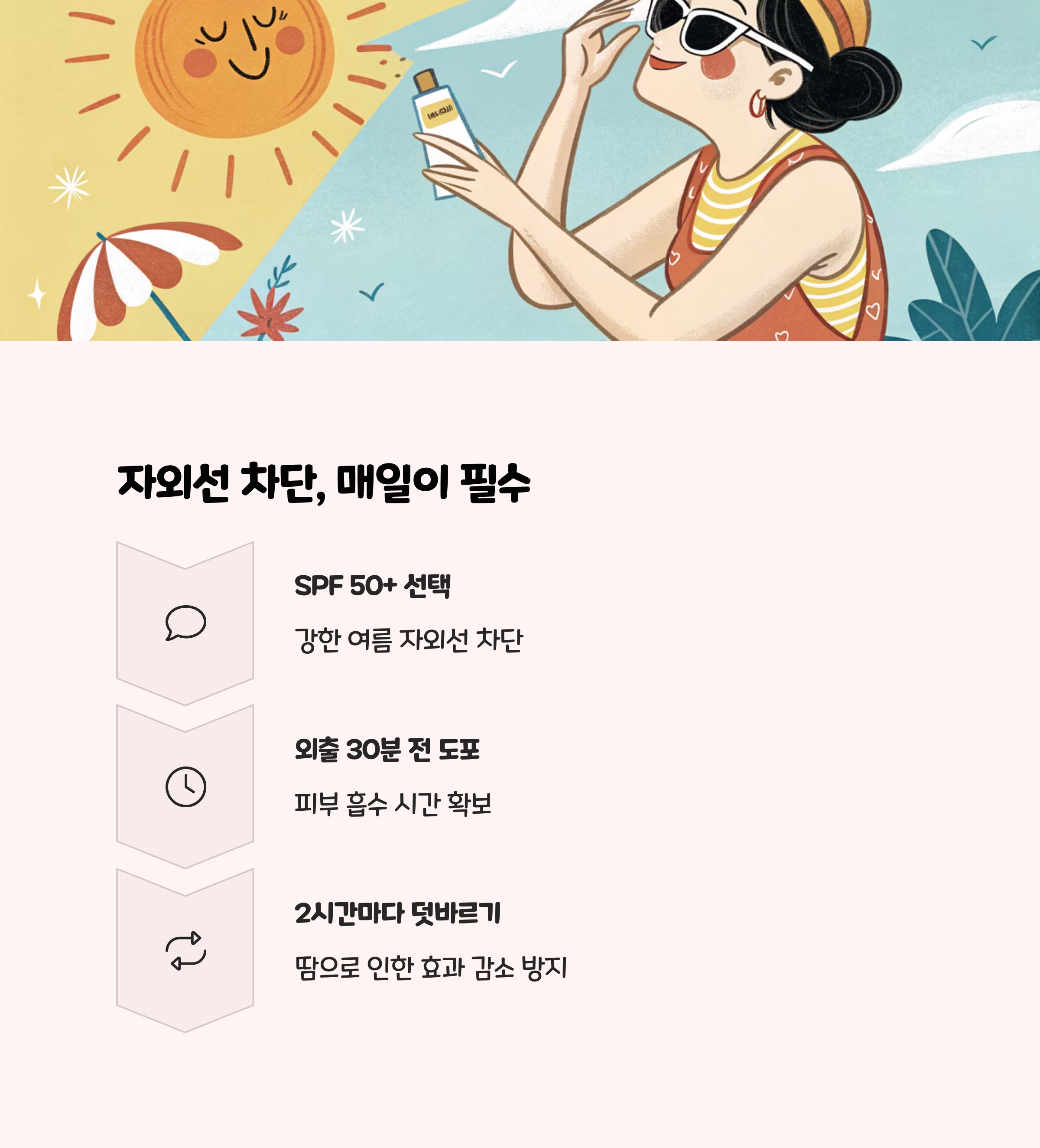 - 외출 30분 전 얼굴·팔·목 등 노출 부위에 충분히 발라주세요. 2~3시간마다 덧바르는 것이 효과적입니다.
