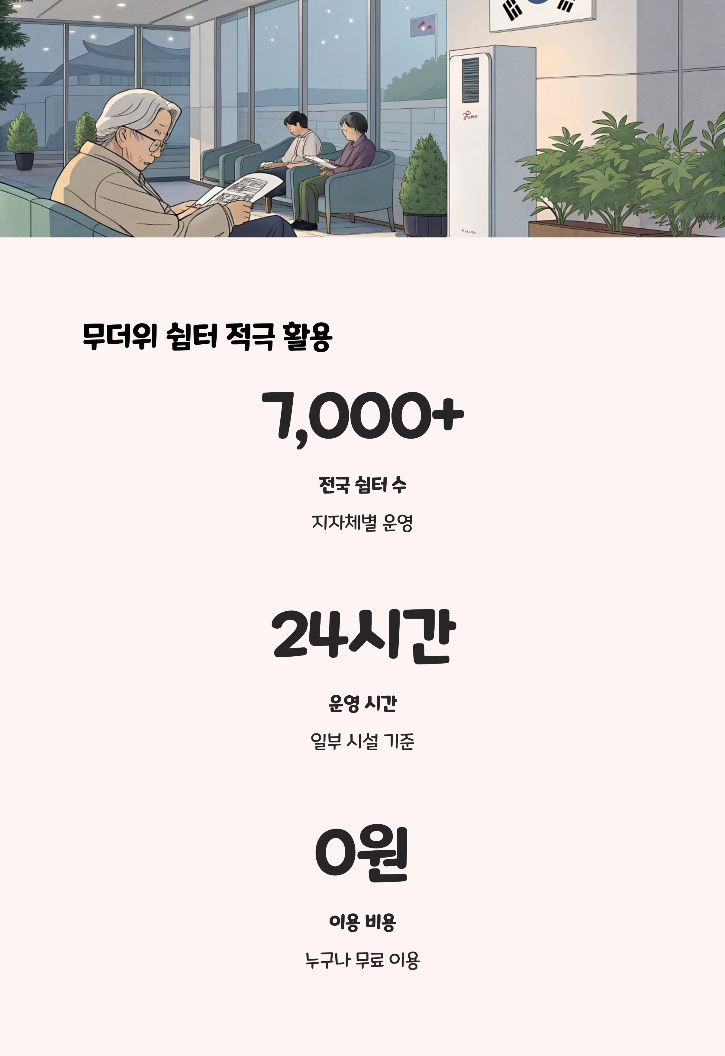 각 지자체 홈페이지나 행정복지센터에서 쉼터 위치와 운영시간을 확인할 수 있습니다. 노인, 취약계층 등은 가까운 쉼터를 적극적으로 이용해 폭염을 피하는 것이 좋습니다.