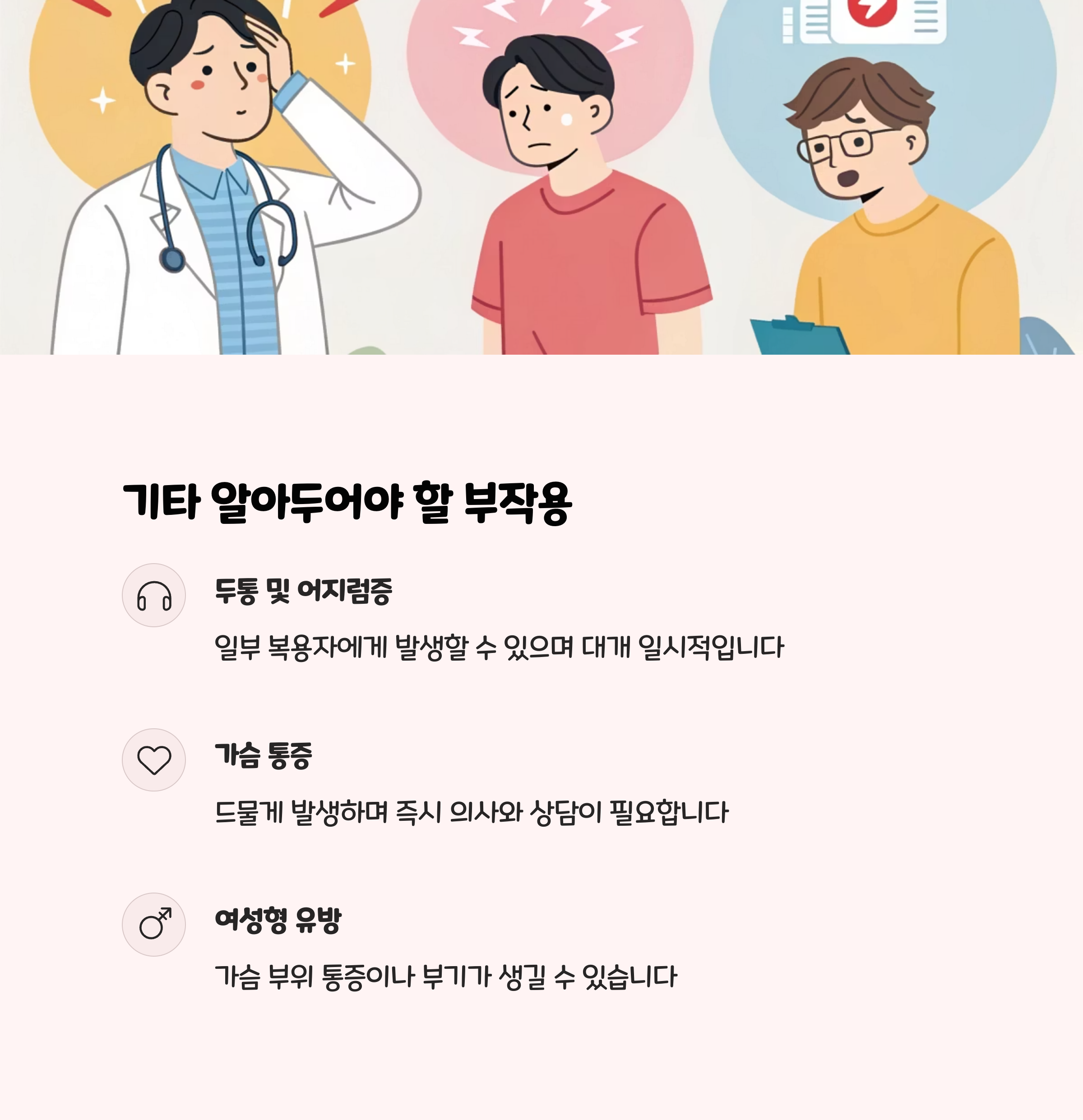 - 여성형 유방, 두통, 체중 증가: 드물게 나타나며, 약물 중단 시 대부분 회복.