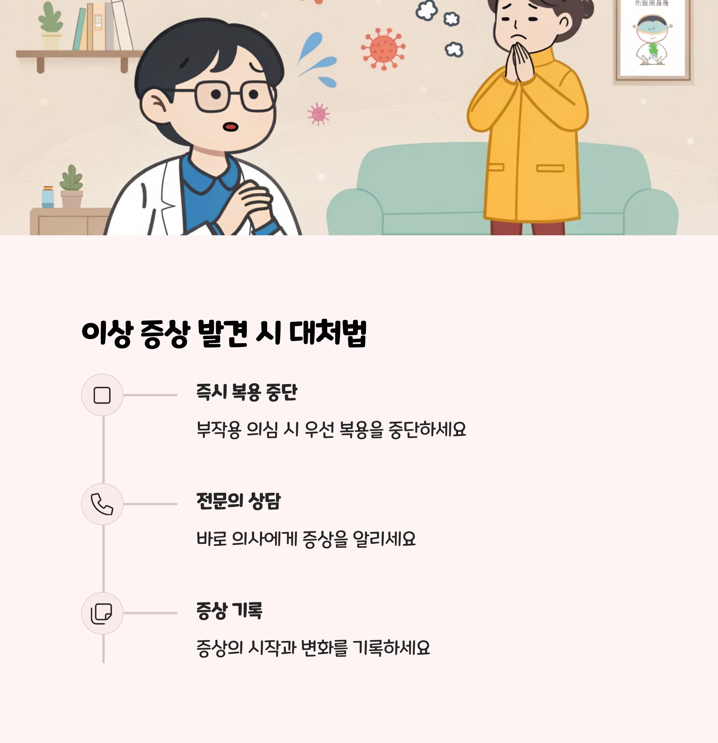 부작용이 경미하다면 일시적으로 관찰하며 복용을 지속할 수 있지만, 증상이 심하거나 지속된다면 즉시 전문가와 상담해 복용 중단 또는 변경을 결정해야 합니다. 대부분의 부작용은 약을 중단하면 자연스럽게 회복됩니다.