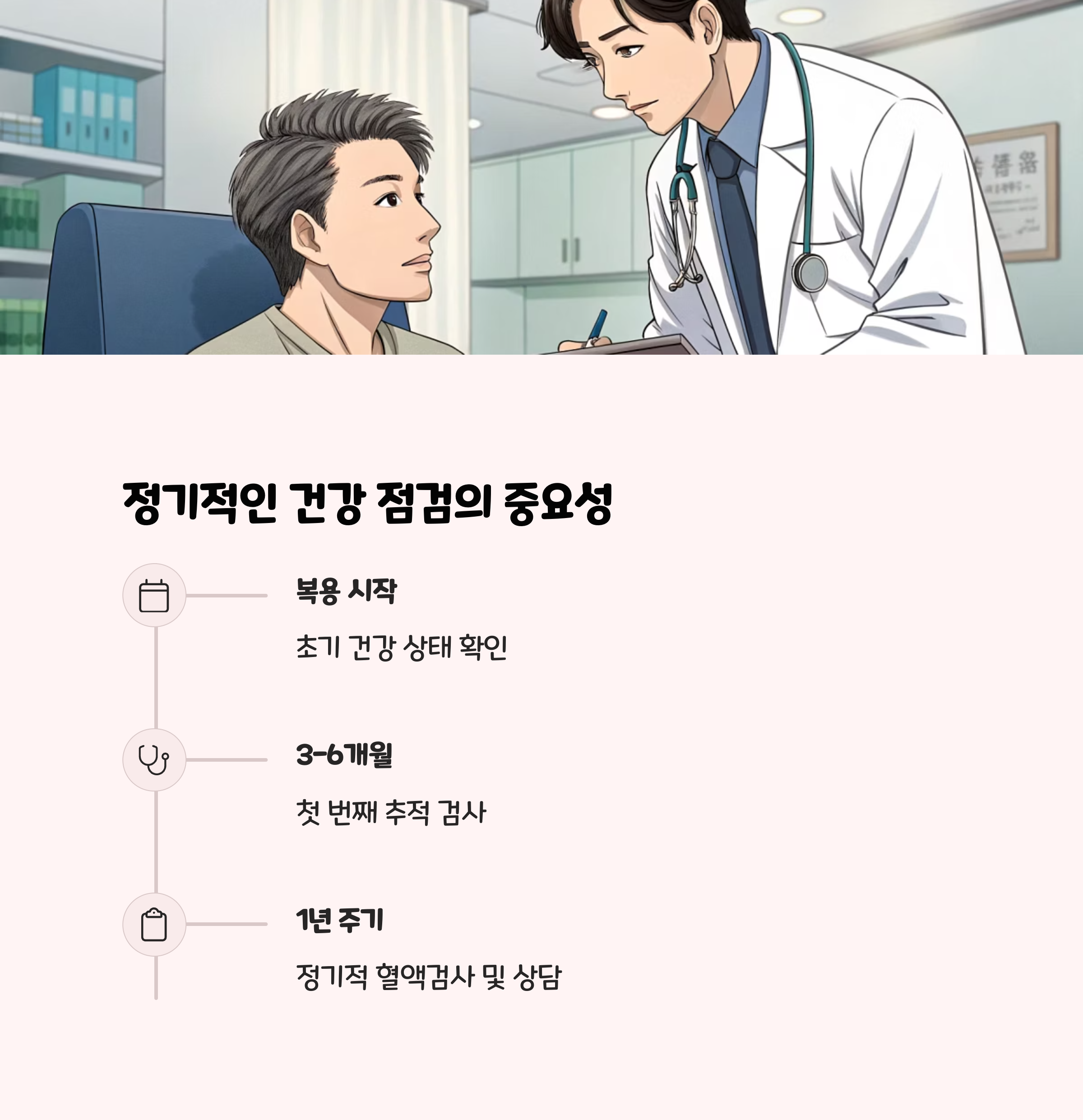 정기적인 건강 검진과 혈액 검사, 상담을 통해 자신의 건강 상태를 체크하세요. 성기능 저하, 두통, 체중 변화 등 이상 증상이 나타나면 즉시 의료진과 상의해 용량 조정이나 대체 약물 사용을 논의해야 합니다.