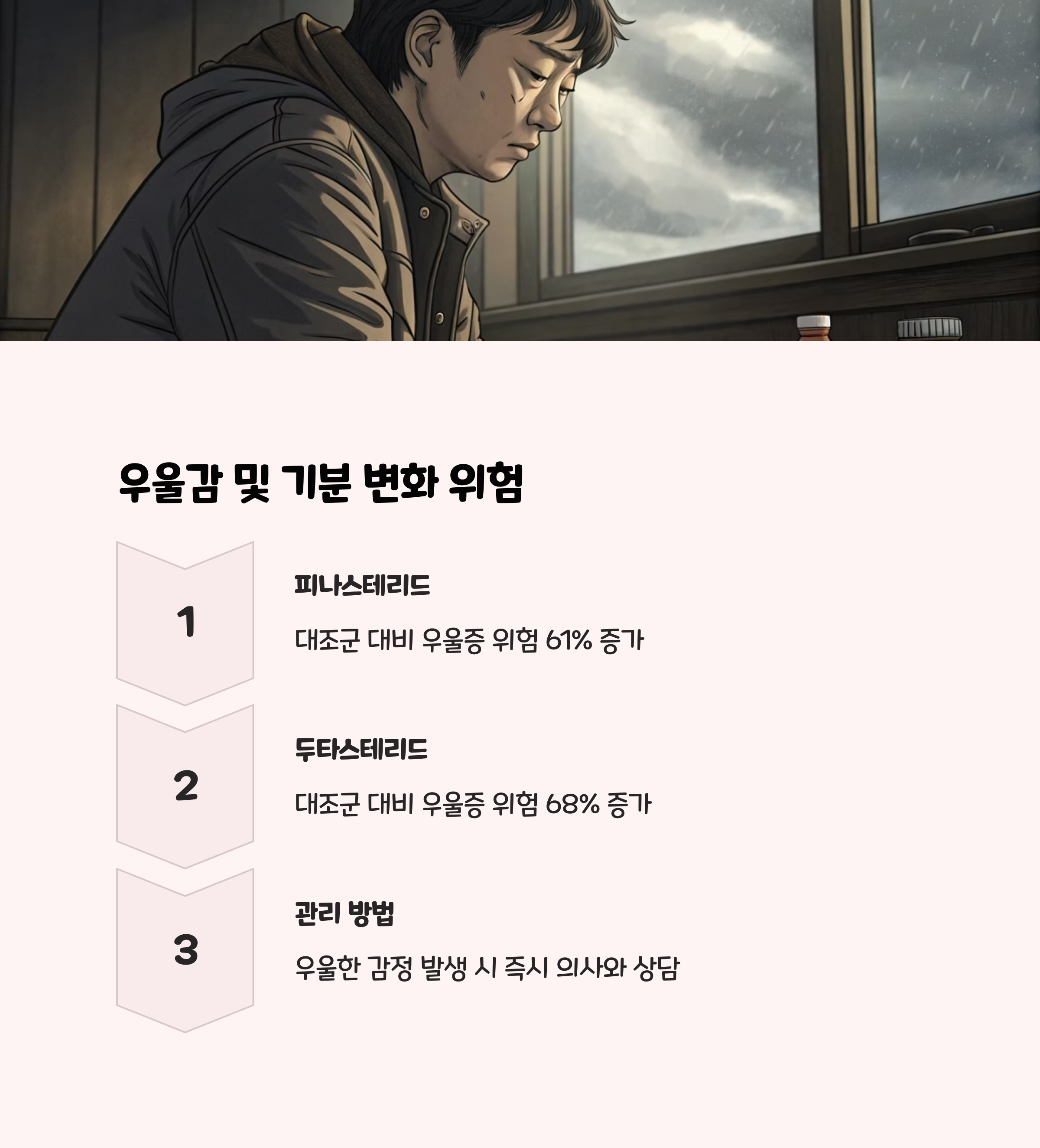 - 성기능 저하: 피나스테리드 복용자의 3~18%, 두타스테리드 복용자의 3~9%에서 성욕 감소, 발기부전, 사정장애 등이 보고됨.