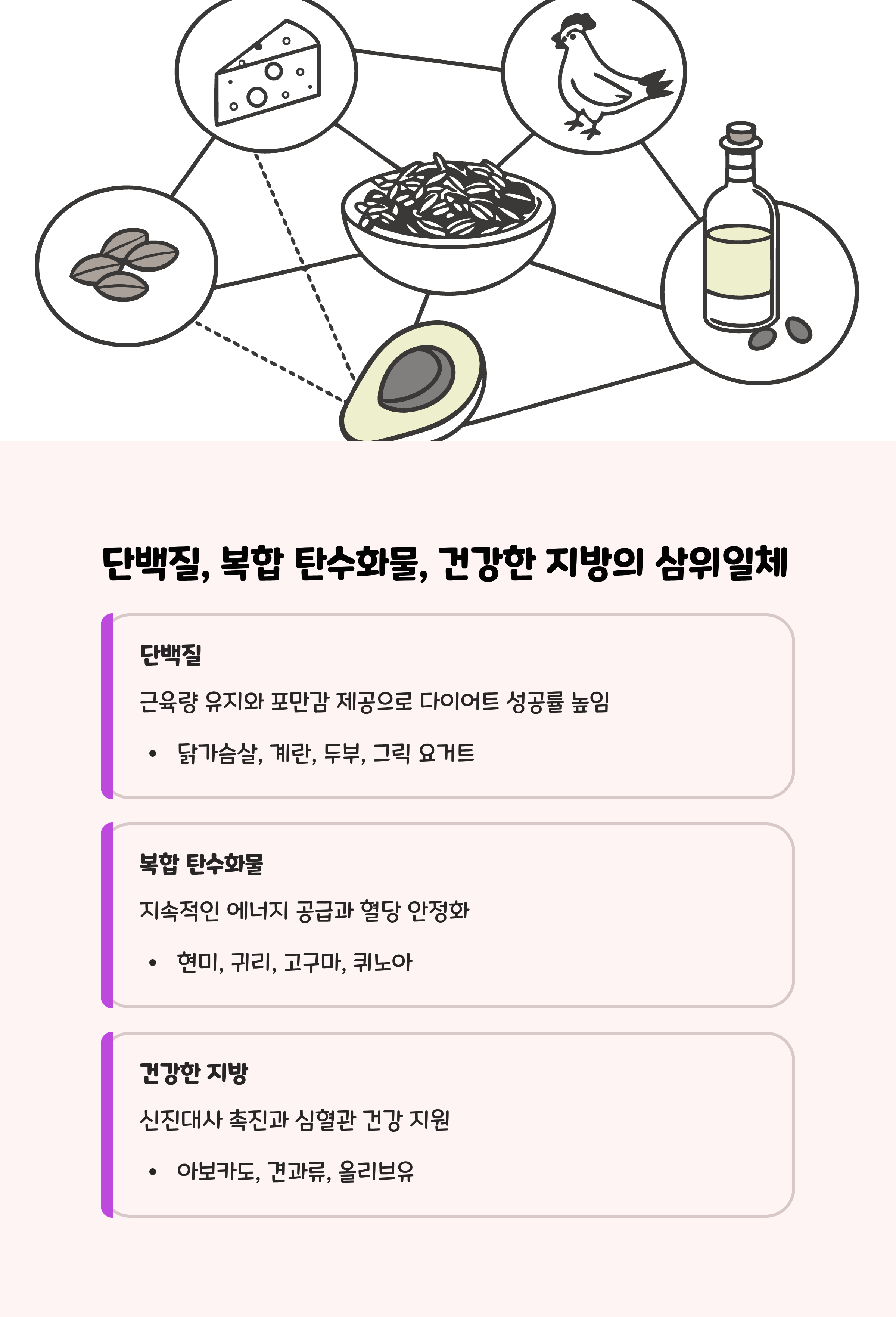 | 단백질 | 닭가슴살, 생선, 그릭 요거트, 렌틸콩 | 근육 유지, 체중 감량 도움 |