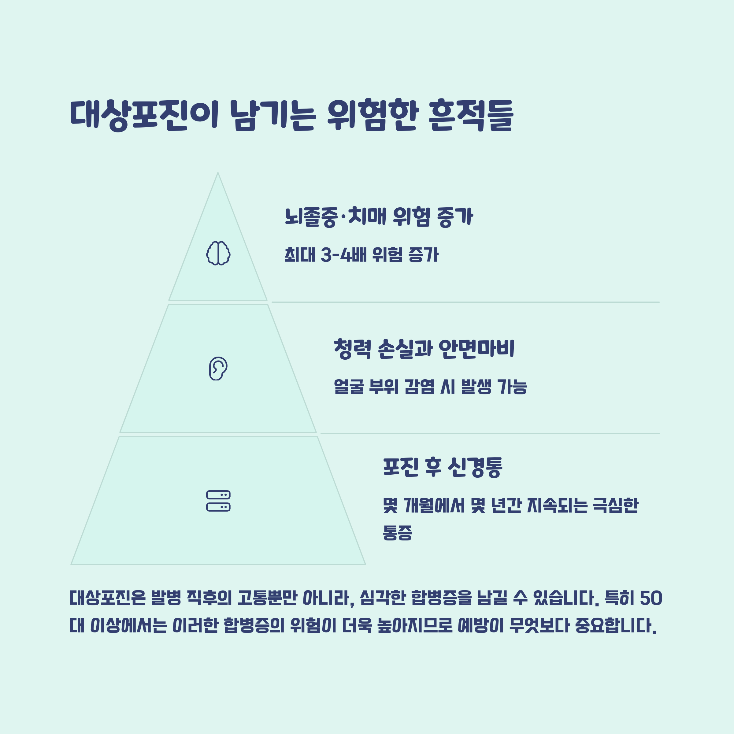 대상포진은 피부에 수포와 발진이 생기는 것뿐만 아니라, 극심한 신경통을 동반하는 것이 특징입니다. 이 통증은 ‘통증의 왕’이라 불릴 정도로 심하며, 치료가 늦어지면 대상포진 후 신경통(herpetic neuralgia)으로 수년간 고통받을 수 있습니다. 50대 이후에는 이러한 합병증의 위험이 더욱 커집니다.