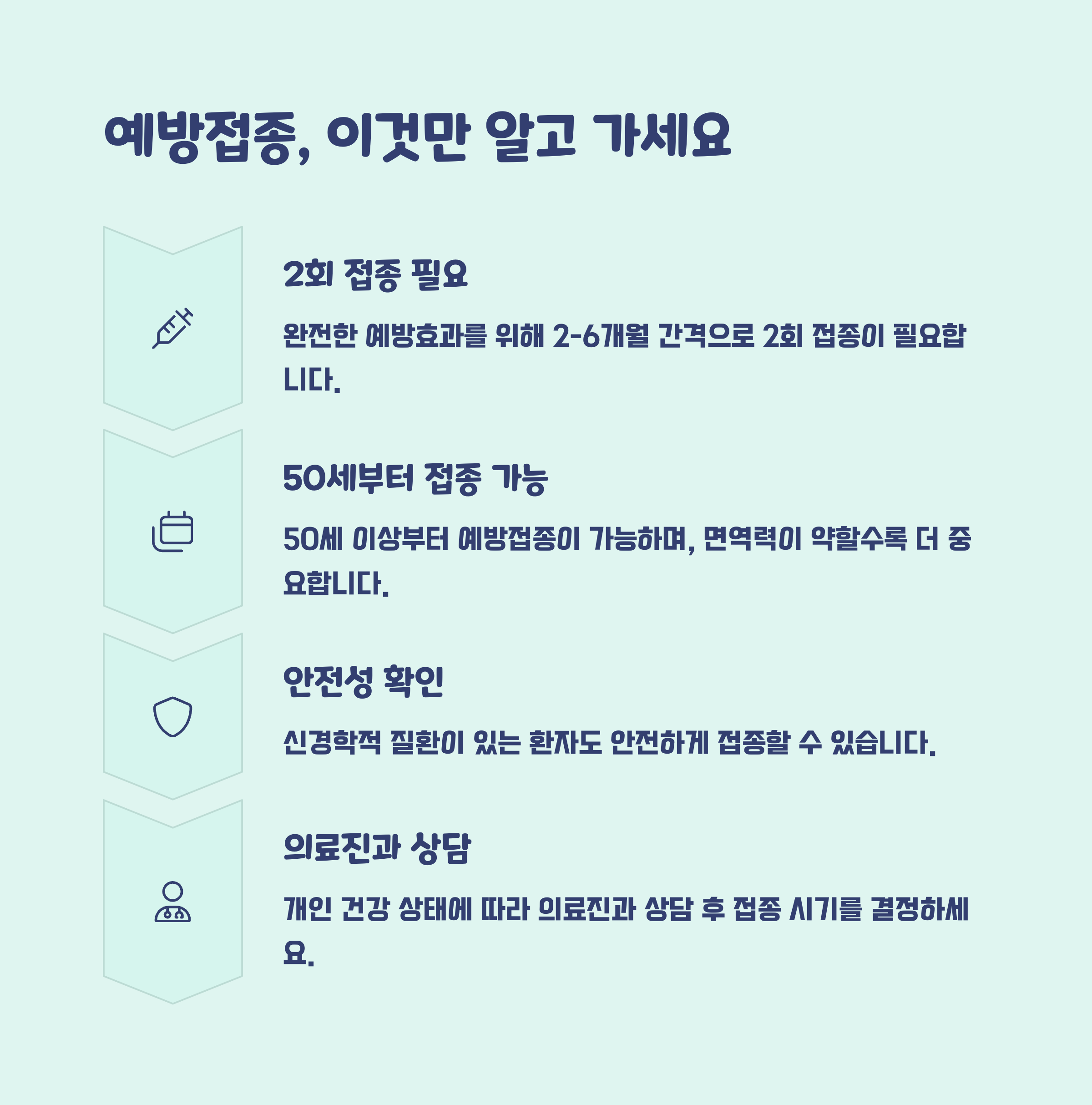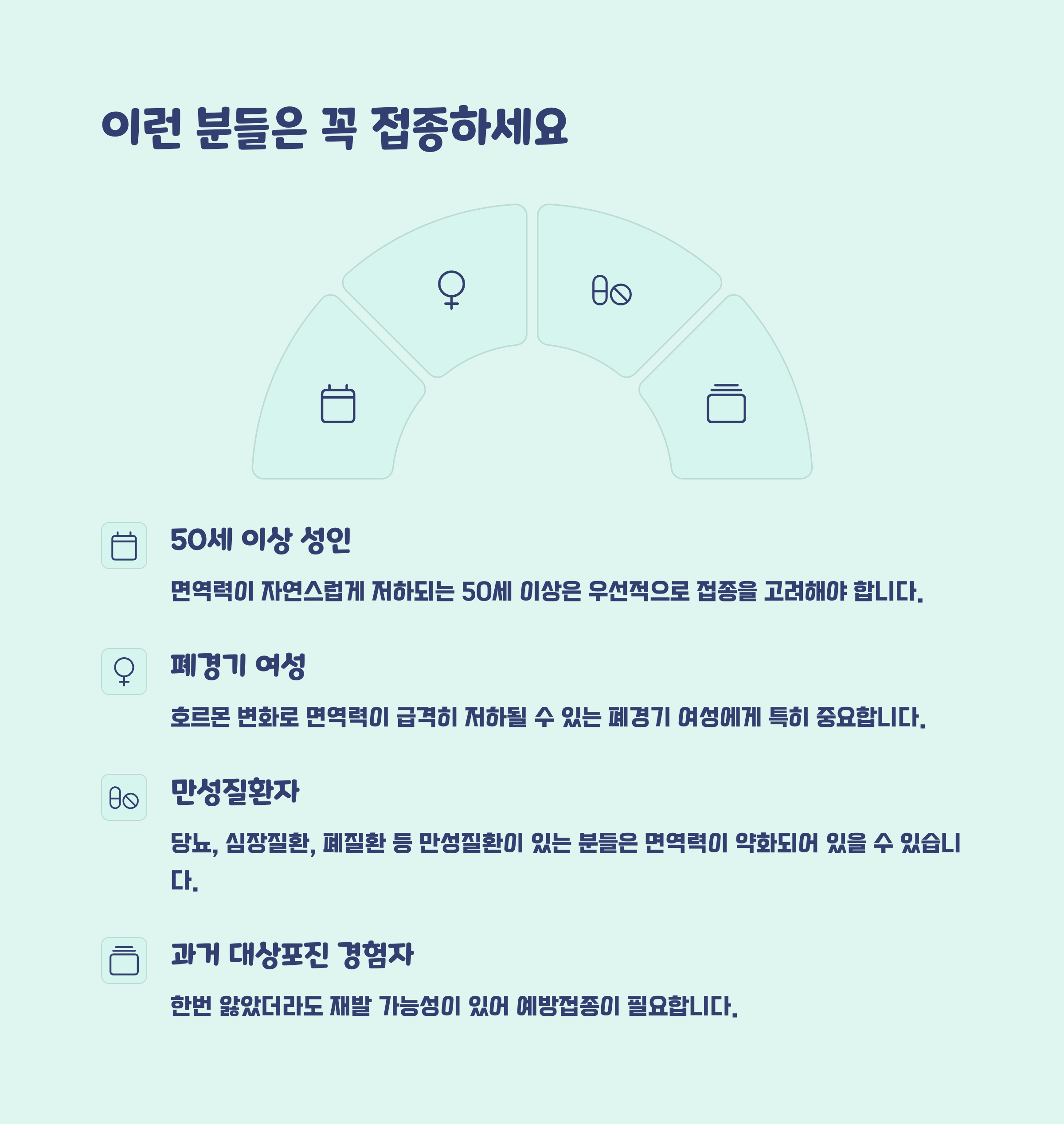 50세 이상에서는 대상포진 발병률이 급격히 증가하고, 신경통 등 합병증 위험도 커집니다. 예방접종을 하면 발병률과 합병증 위험을 크게 줄일 수 있어, 건강한 노후를 위해 꼭 맞는 것이 권장됩니다.