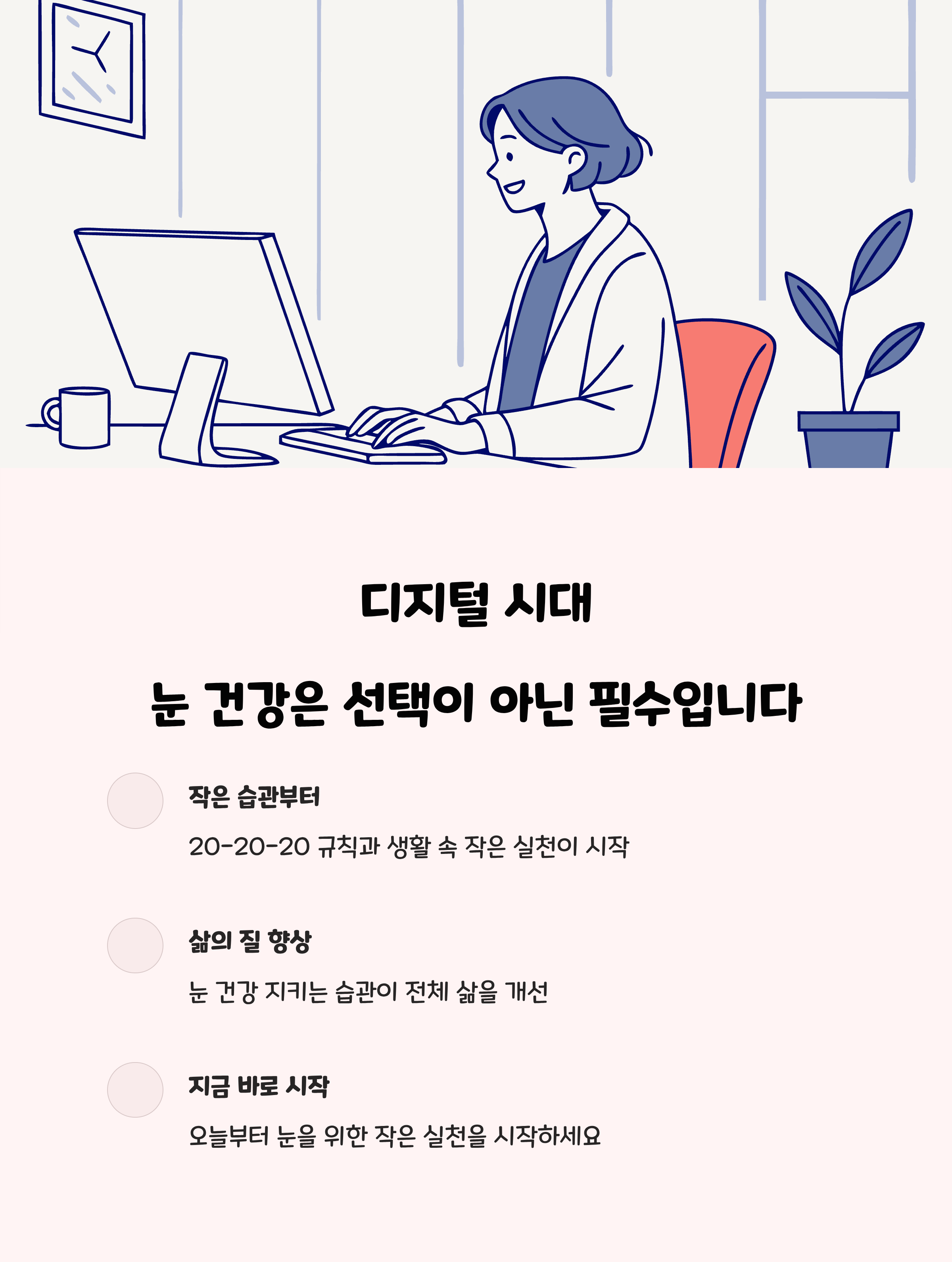 눈 건강을 위한 습관과 환경 조성이 무엇보다 중요합니다. 장시간 디지털 기기 사용을 피하기 어렵다면 위 내용을 생활 속에서 꾸준히 실천해 눈의 피로를 줄이고, 건강한 시력을 유지하시길 바랍니다. 정기적인 안과 검진도 꼭 챙기세요. 눈은 한 번 손상되면 회복하기 어려운 중요한 기관이기에, 오늘부터라도 소중히 관리하는 것이 최선입니다.