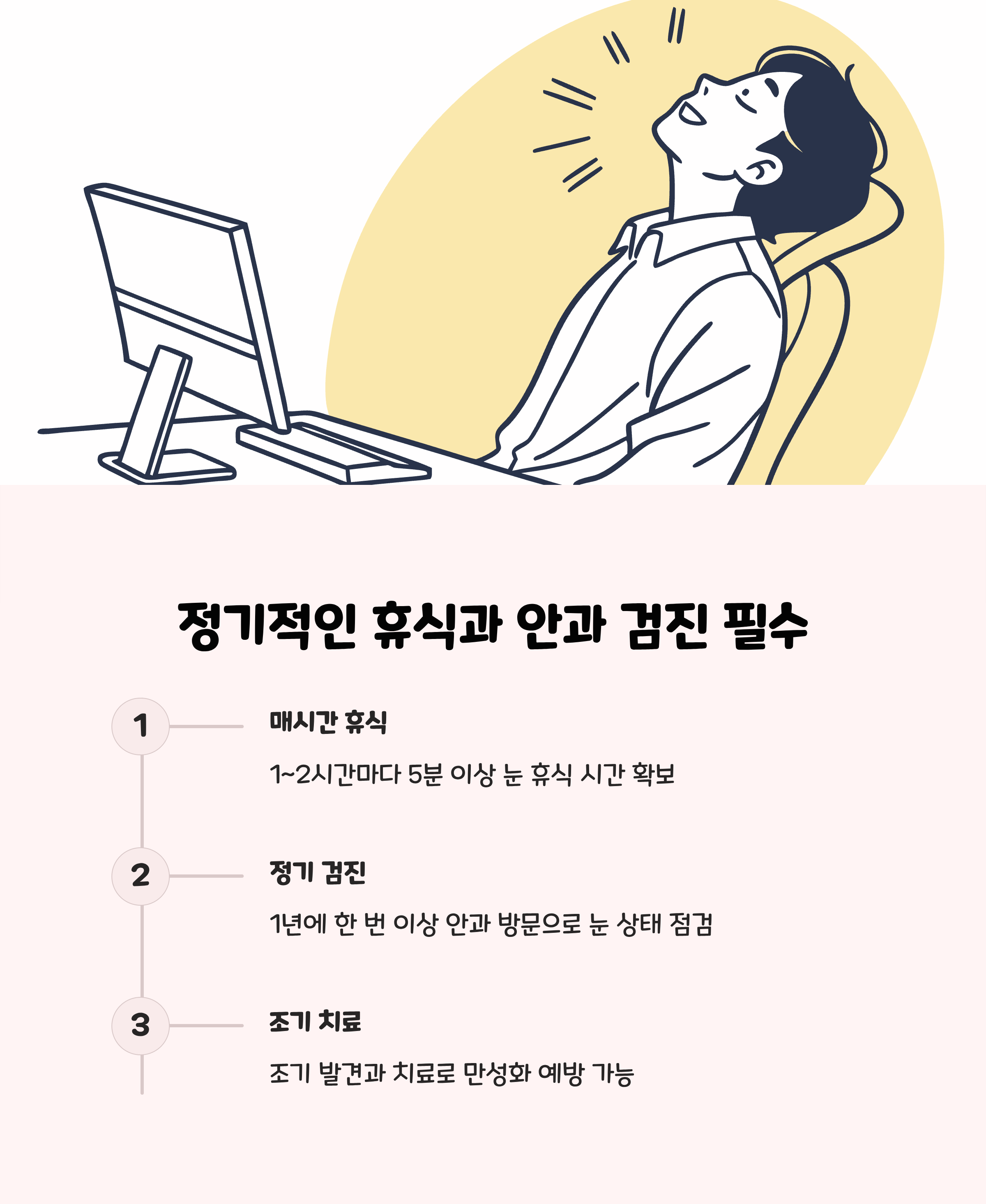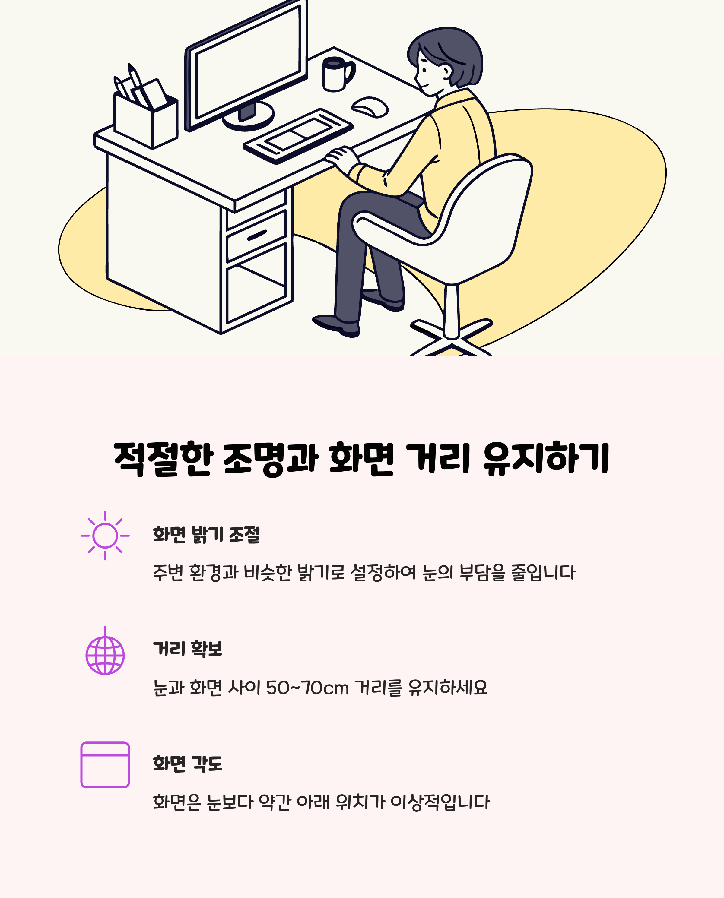 • 적절한 조명과 화면 설정: 주변 조명과 모니터 밝기를 조절해 눈부심과 눈의 부담을 줄입니다.