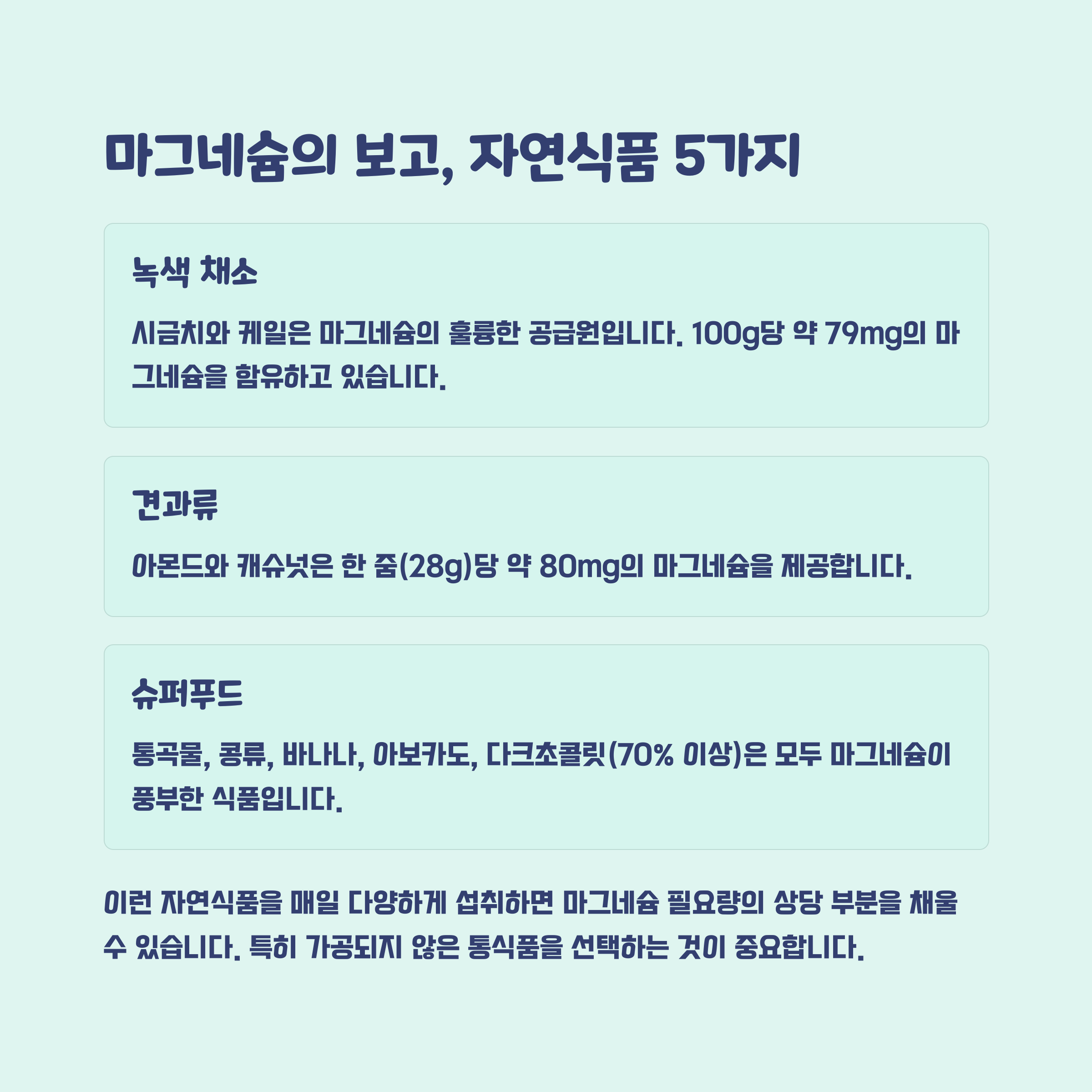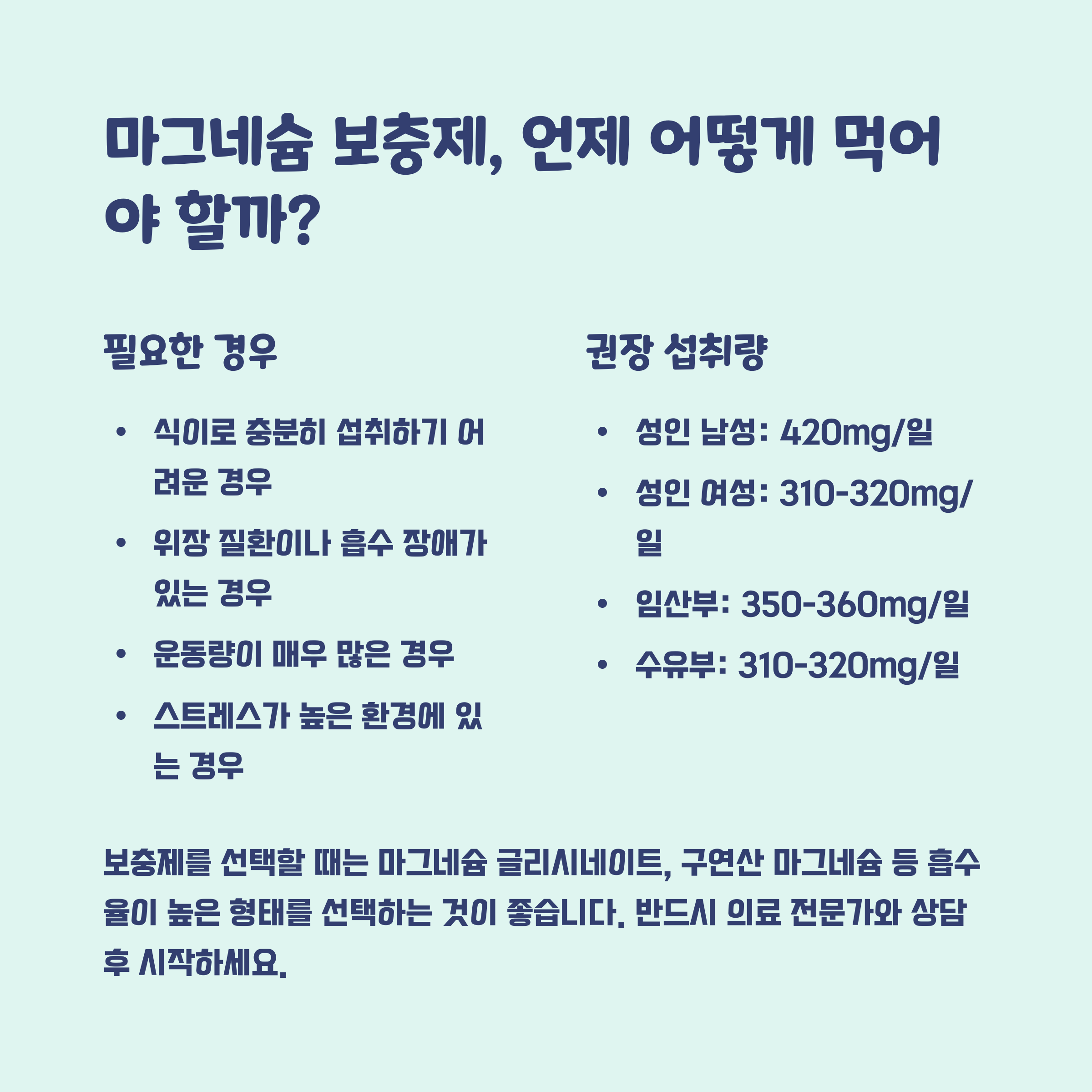 식이 섭취만으로 부족하다면, 마그네슘 보충제를 고려할 수 있습니다. 다만 신장 질환이 있거나, 특정 약물을 복용 중인 경우에는 반드시 전문가와 상담 후 복용해야 합니다.