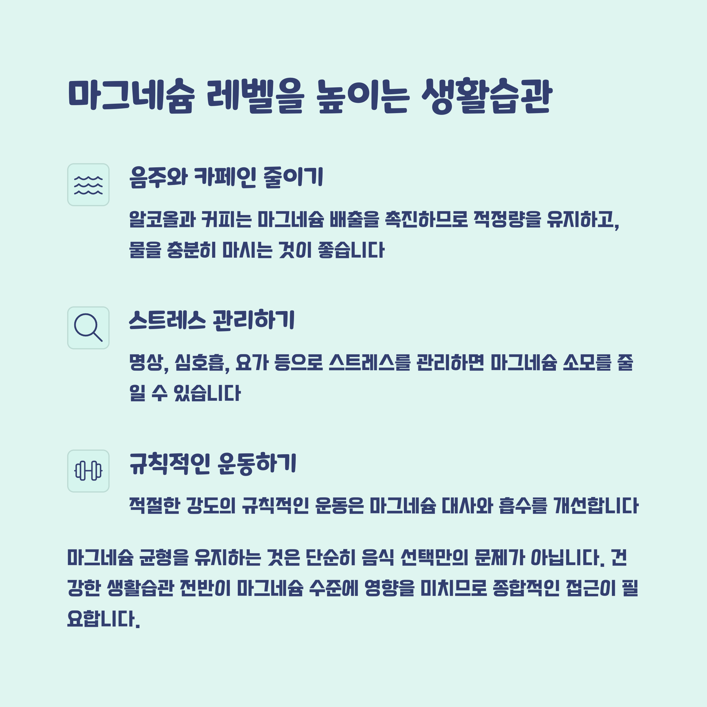 이러한 습관은 마그네슘의 체내 흡수와 보유에 긍정적인 영향을 줍니다.