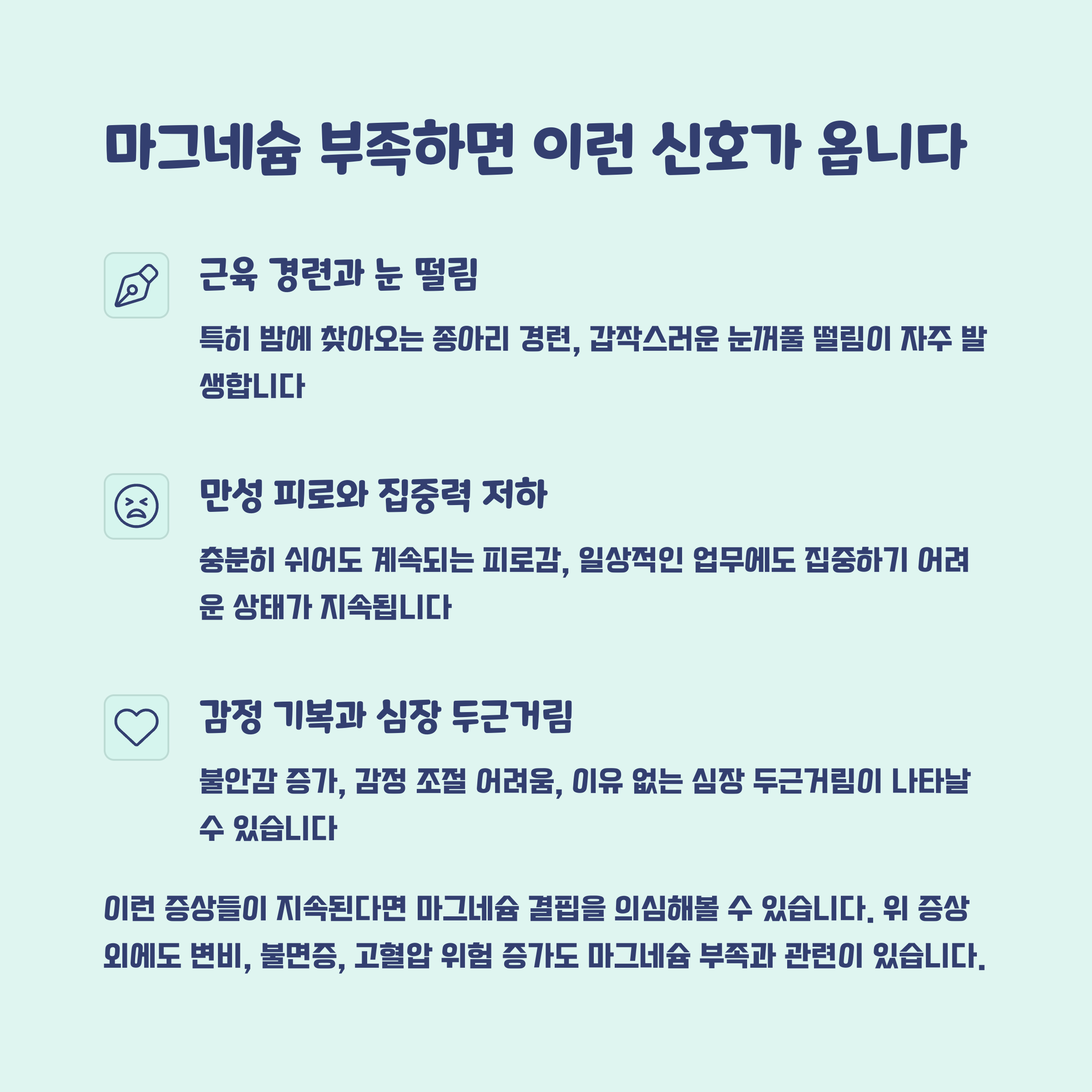 마그네슘 부족은 다양한 신체적·정신적 증상으로 나타나지만, 일상에서 흔히 겪는 증상과 겹쳐 쉽게 간과될 수 있습니다. 근육 경련, 만성 피로, 감정 기복, 심장 두근거림, 변비 등 5가지 대표 신호를 기억하고, 평소 식습관과 생활습관을 점검해보세요. 필요하다면 혈액검사 등으로 마그네슘 수치를 확인하고, 전문가의 도움을 받아 적절한 보충과 관리를 시작하는 것이 건강을 지키는 첫걸음입니다.