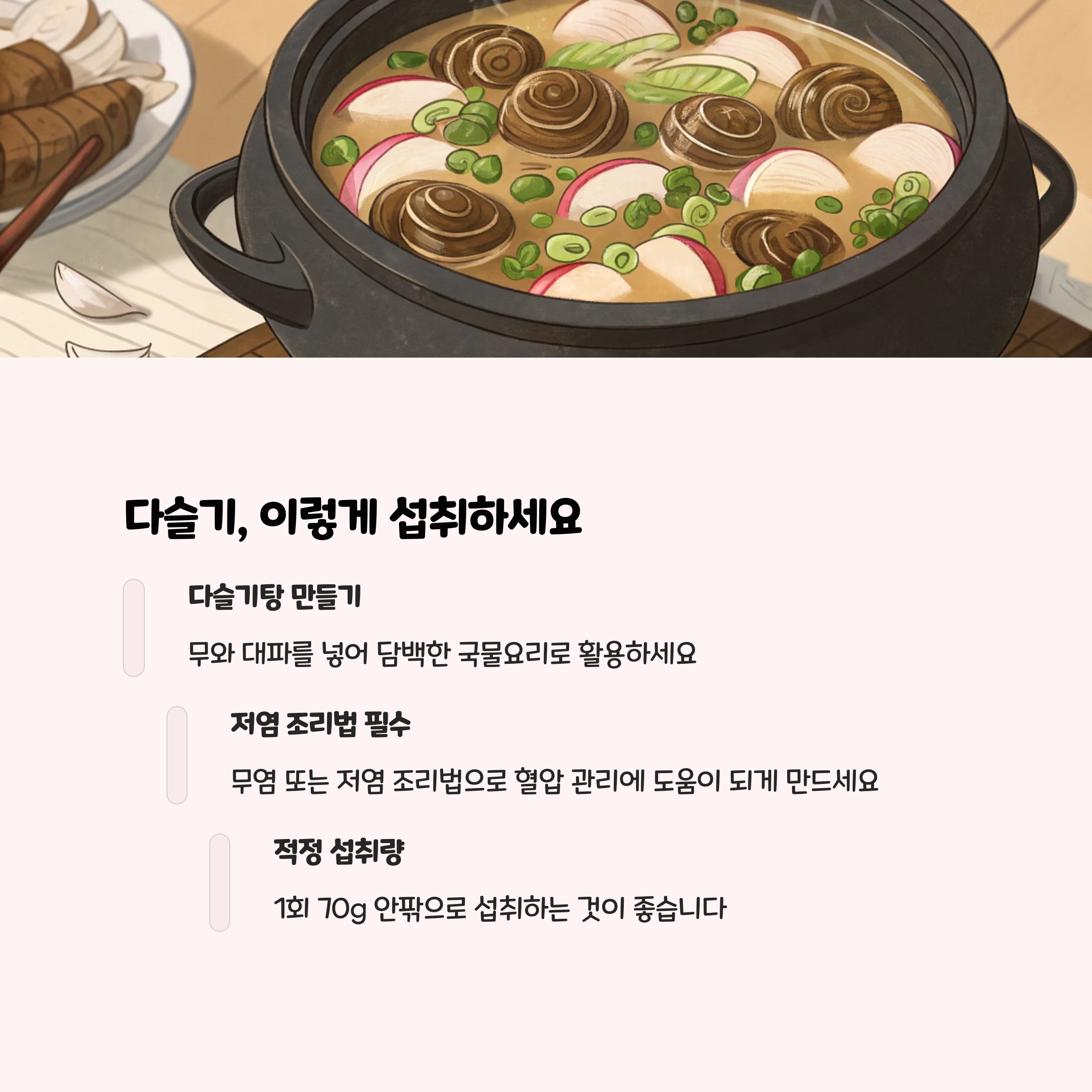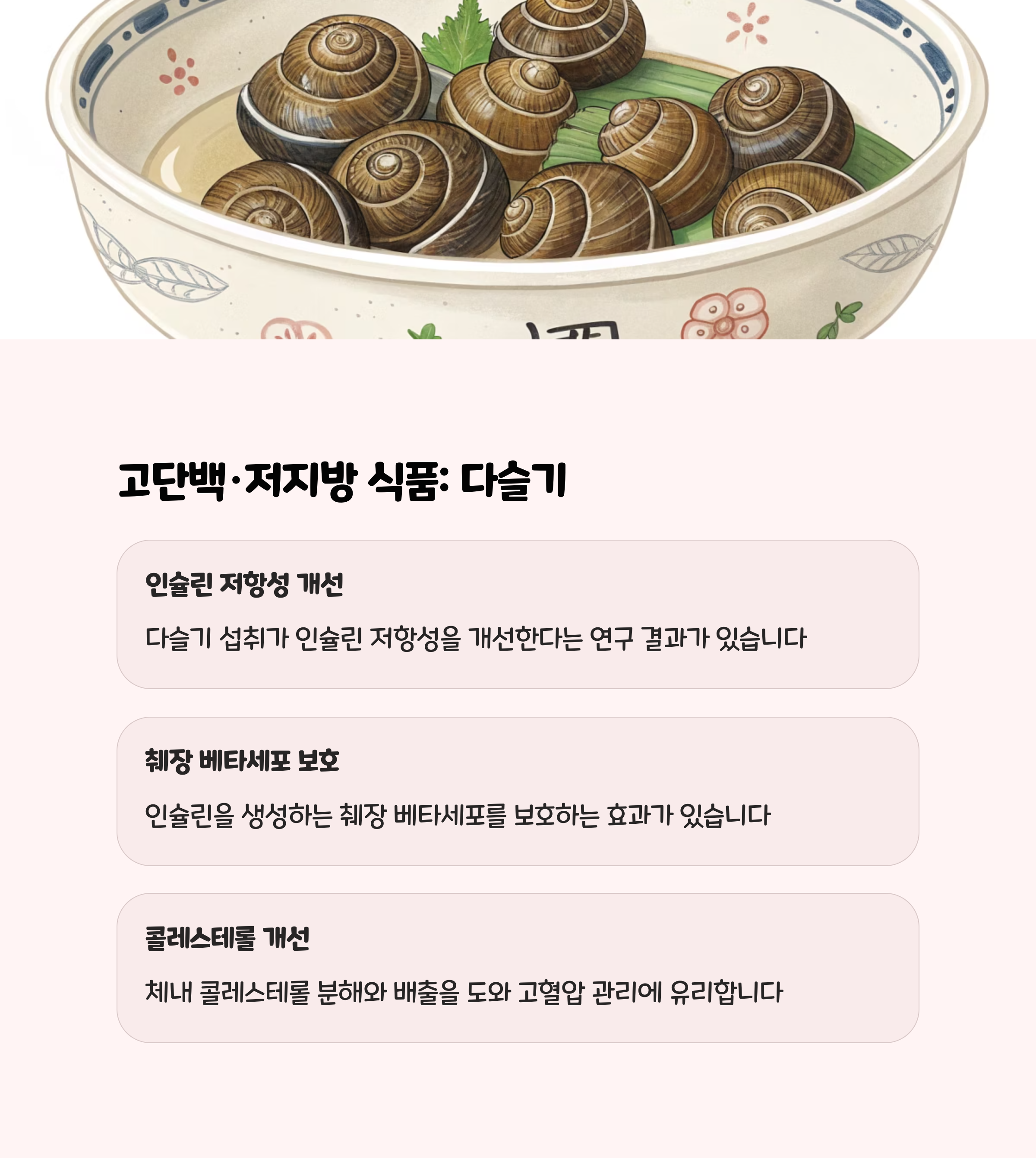 다슬기는 단백질 함량이 60.7%로 쇠고기(58.7%)보다 높고, 칼슘은 우유의 13배에 달합니다. 연구에 따르면 다슬기는 췌장 베타세포를 보호하고 인슐린 저항성을 개선하는 데 도움을 주며, 간 기능 회복과 장 건강에도 유익합니다. 저지방·고단백 식품으로 당뇨와 고혈압 환자 모두에게 추천할 수 있습니다.