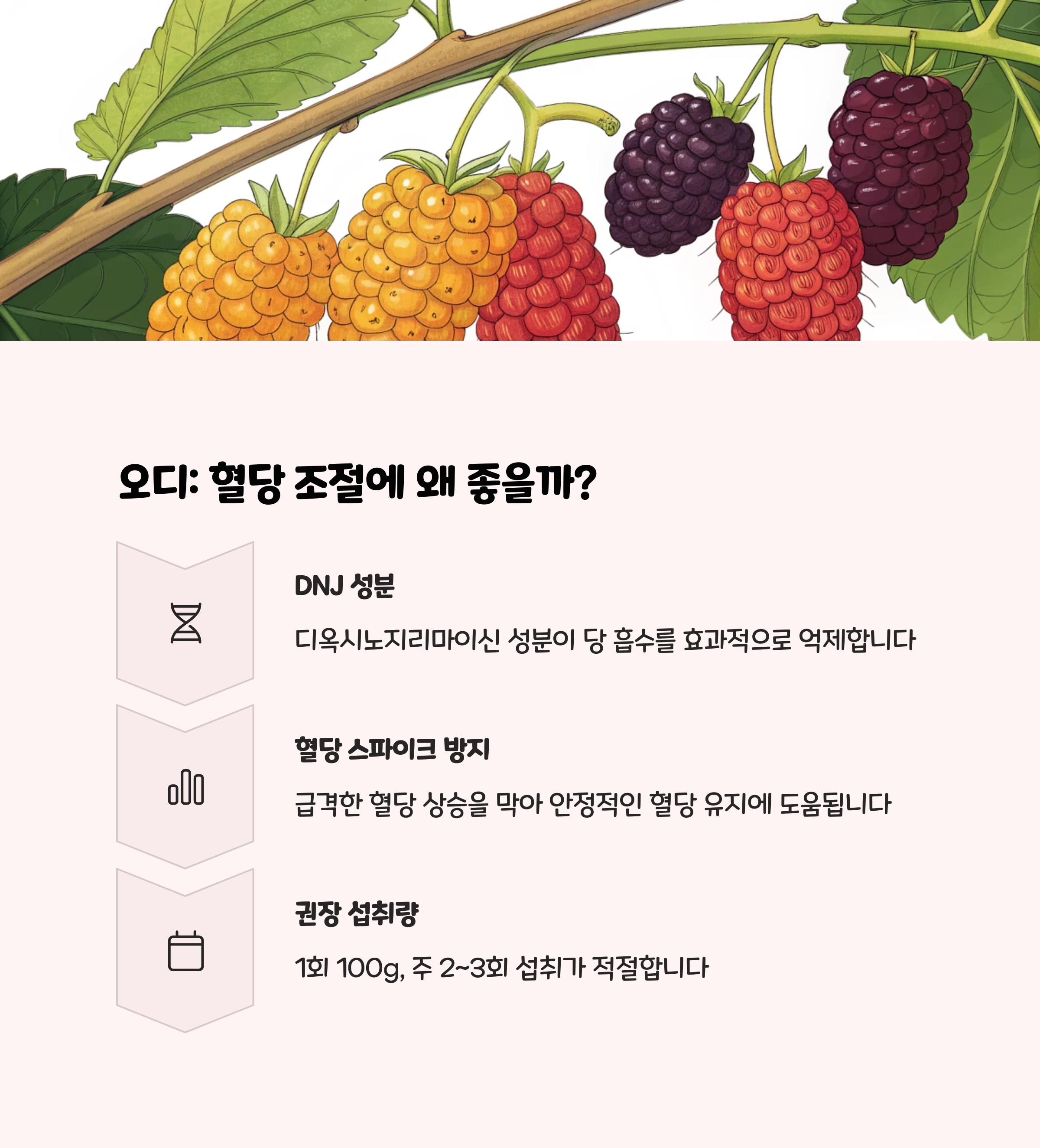 오디는 뽕나무의 열매로, 데옥시노지리마이신(DNJ)이라는 성분이 풍부해 당질 분해 효소를 억제하여 식후 혈당의 급격한 상승을 막아줍니다. 실제로 오디의 혈당지수(GI)는 53으로 낮아 당뇨 환자에게 적합한 과일입니다. 단, 1회 섭취량은 10개 내외로 제한하는 것이 좋습니다. 오디는 동의보감에서도 당뇨, 고혈압, 성인병 예방에 탁월하다고 기록되어 있습니다.
