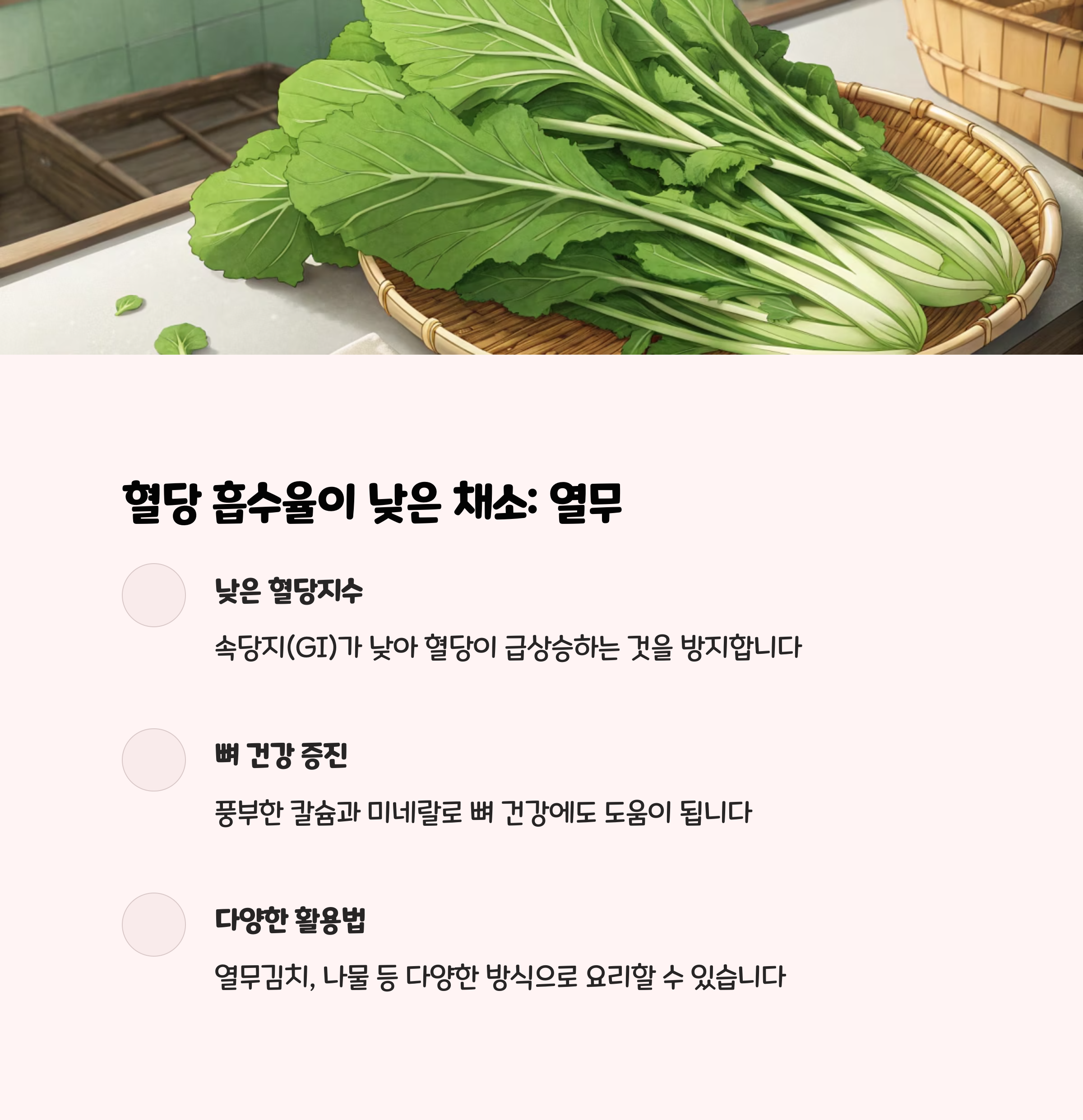 열무는 사포닌이 풍부해 혈중 포도당을 세포 내로 흡수시키는 데 도움을 주고, 혈중 콜레스테롤 수치를 낮춰 동맥경화와 고혈압 예방에 유익합니다. 특히 열무김치나 열무물김치는 여름철 입맛을 돋우면서도 혈당과 혈압 관리에 도움이 됩니다. 단, 김치류는 저염으로 담가 섭취하는 것이 중요합니다.