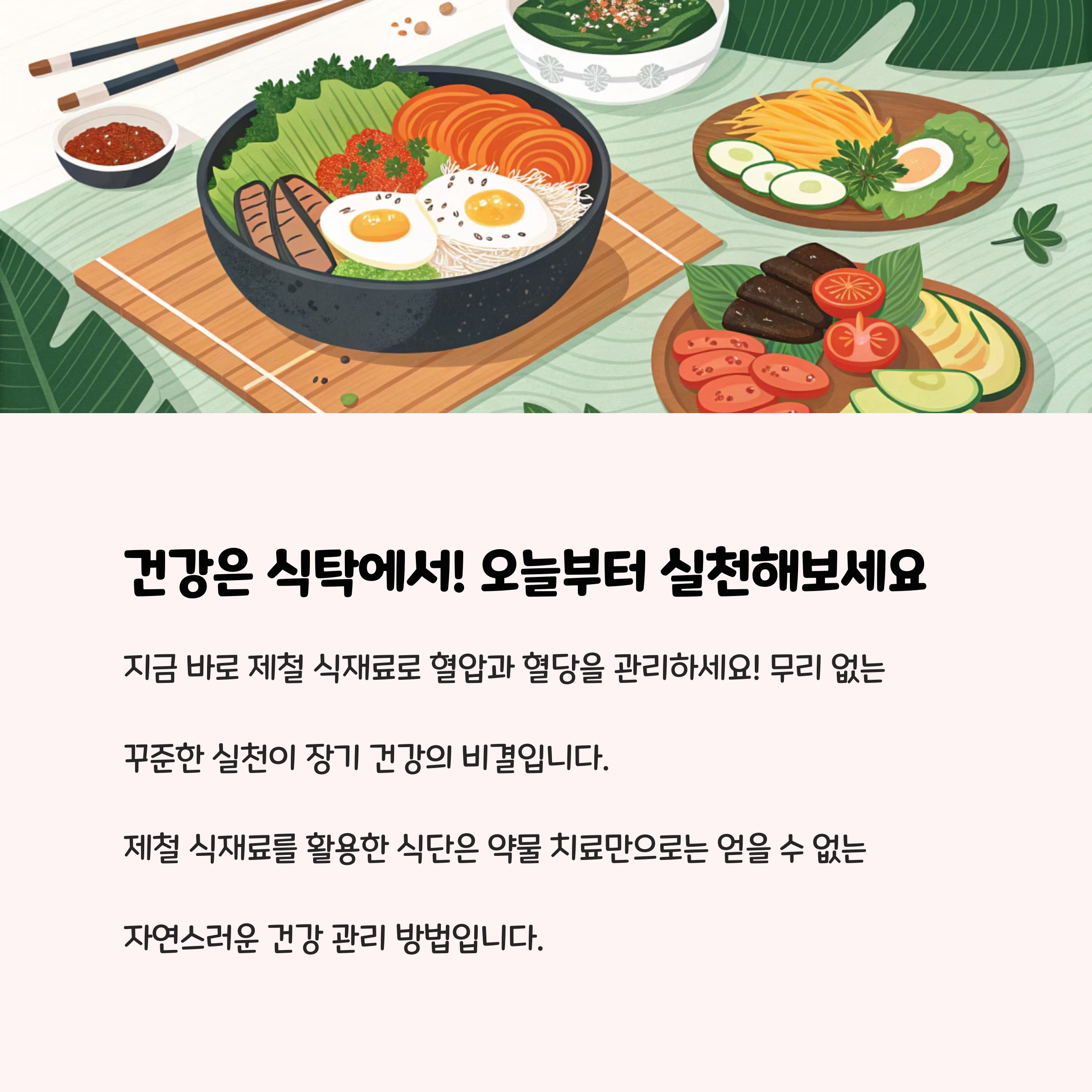 본 내용은 대한민국 정책브리핑, 서울특별시 식생활종합지원센터, 보건복지부, 삼성서울병원, 의령군보건소 등 국내 공공기관과 전문 의료기관에서 제공한 제철 식품의 영양 정보와 만성질환(당뇨·고혈압) 환자를 위한 식사 지침을 종합적으로 참고하였습니다.
