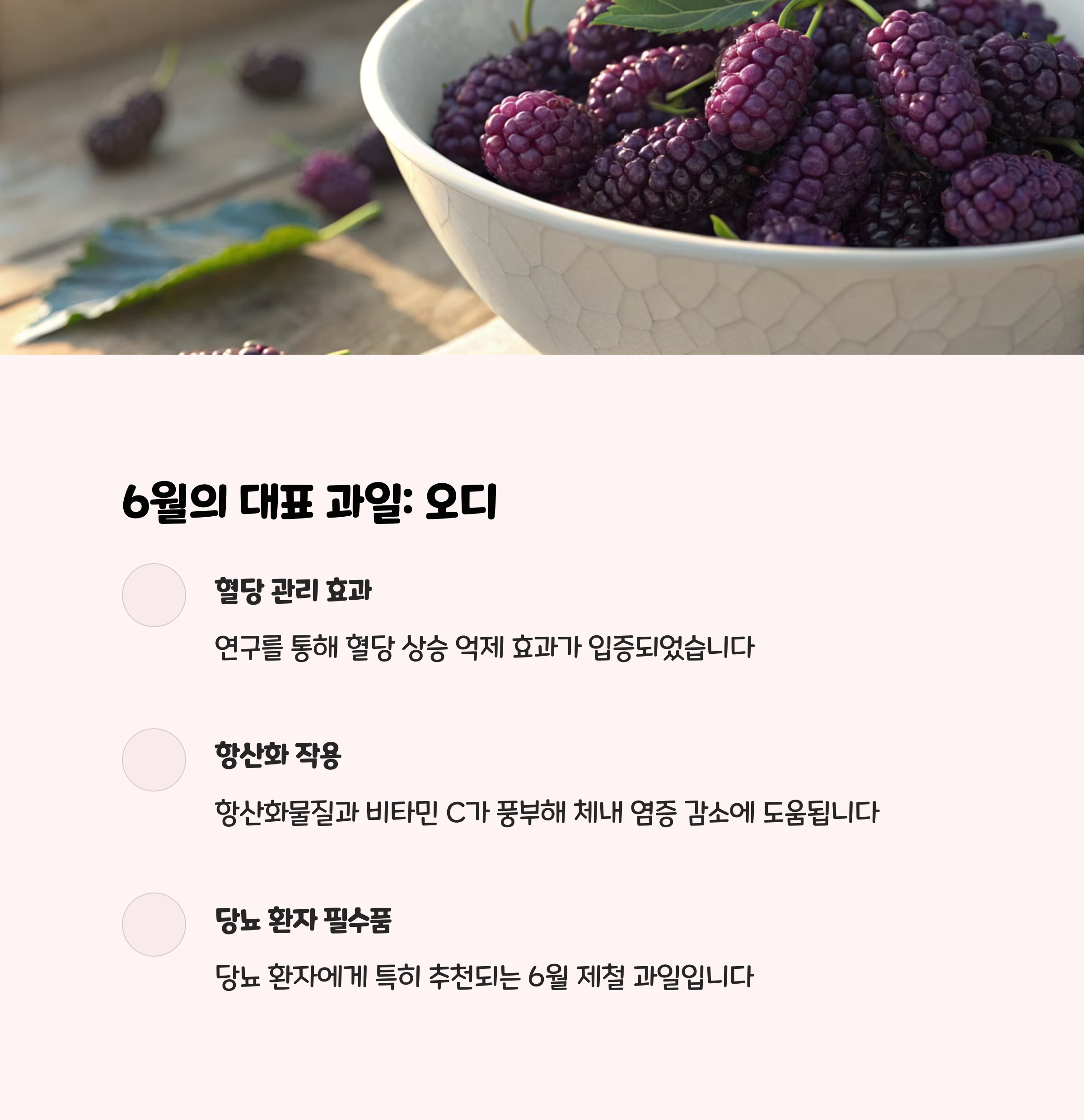 6월의 제철 식품은 만성질환 환자에게 자연이 주는 최고의 건강 솔루션입니다. 오디, 다슬기, 열무, 감자, 곤드레 등은 혈당과 혈압 조절에 도움을 주는 대표적인 식재료입니다. 저염식과 적정량 섭취를 기본으로, 제철 식품을 골고루 활용해 건강한 여름을 준비하세요. 과식은 피하고, 조리 시 소금·설탕 사용을 줄이며, 신선한 식재료 본연의 맛을 즐기는 습관이 만성질환 관리의 첫걸음입니다.