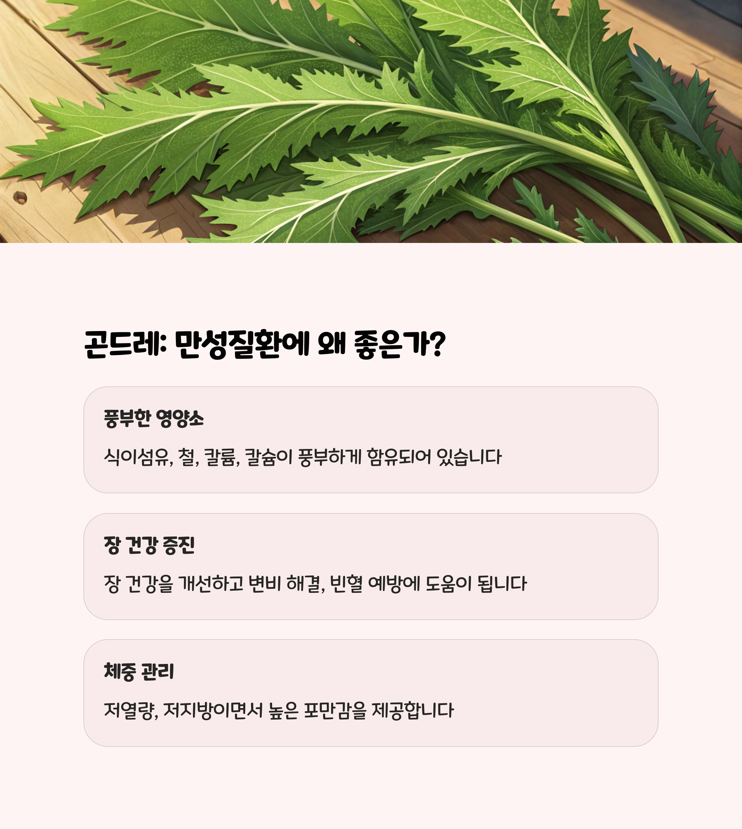곤드레는 칼슘, 인, 철분이 많아 뼈 건강과 빈혈 예방에 좋고, 식이섬유가 풍부해 장 건강과 혈당 조절에 도움이 됩니다. 곤드레밥 등으로 활용하면 저염식에도 적합합니다.
